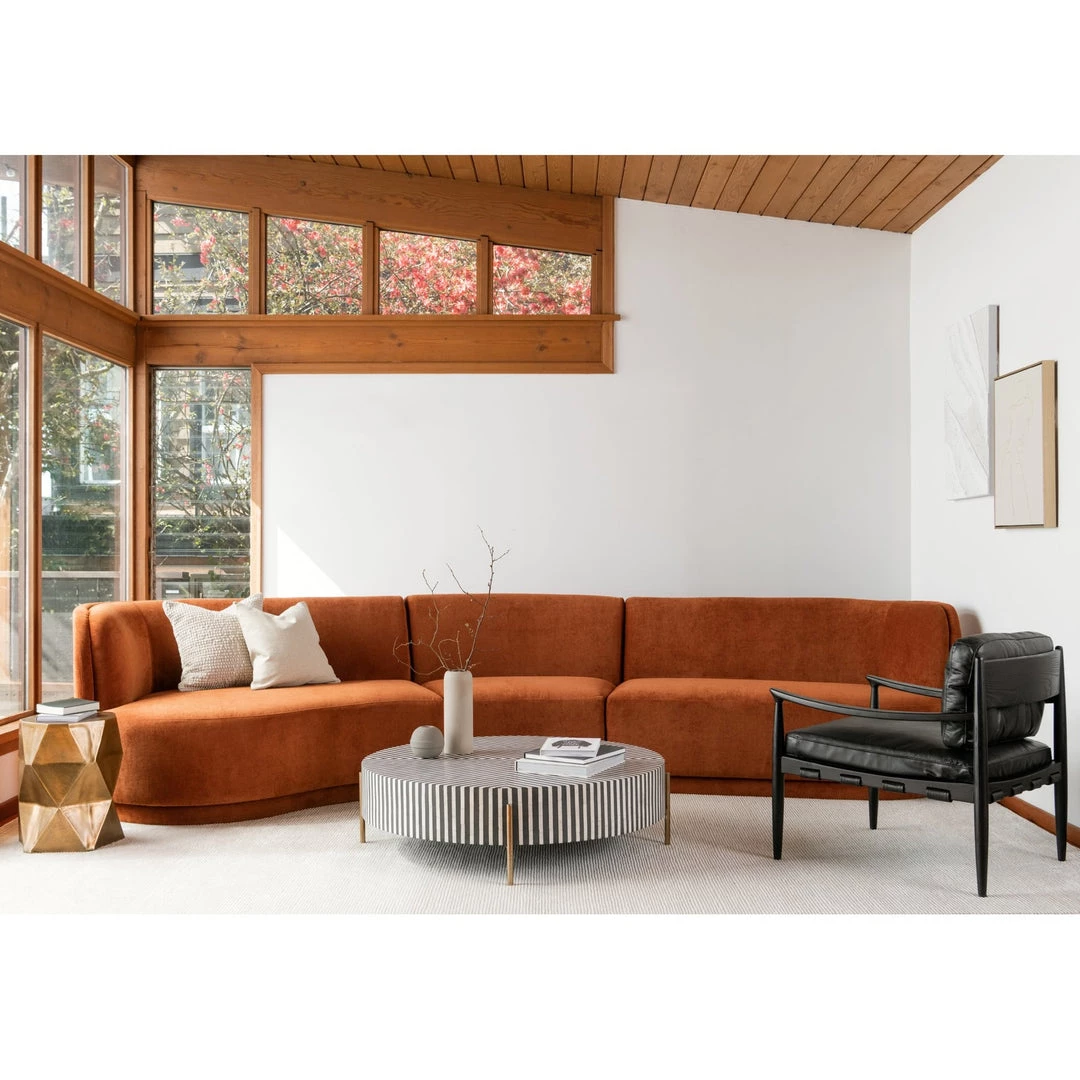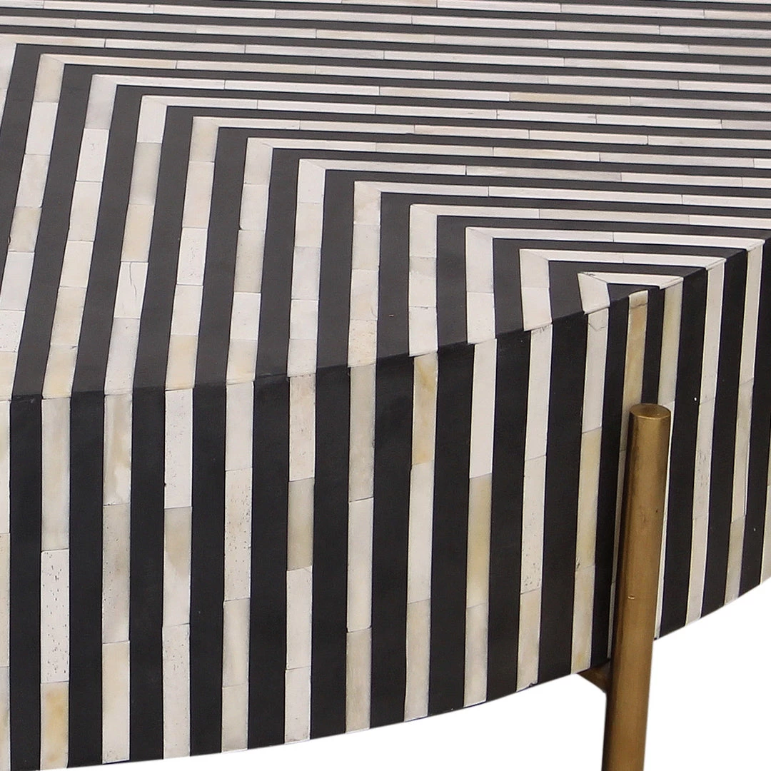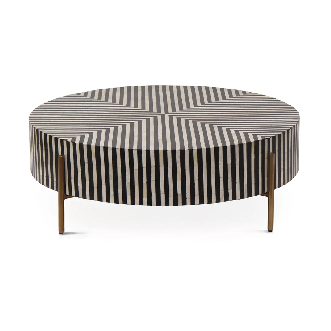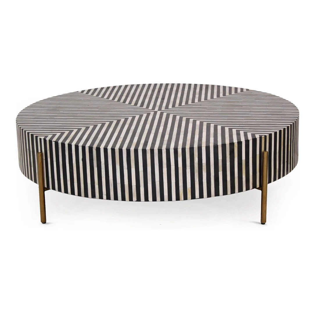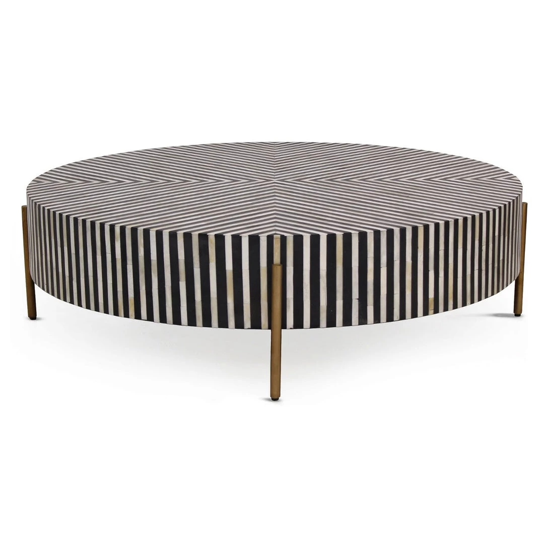 A sleek and unique centerpiece for a living room, this coffee table features intricately patterned camel bone veneer. The Chameau coffee table has a low to the ground profile and circular design. The brass legs and resin coating adds bold flare to its contemporary design.