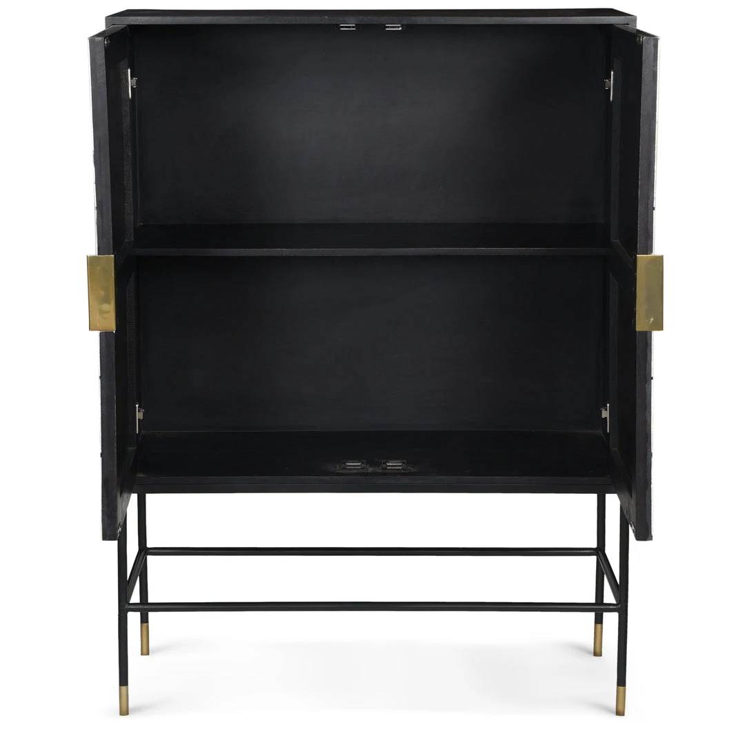 The Ligne Cabinet is a luxurious affair with a dark brown-black finished solid mango wood case, geometric bone veneer door fronts and brass hardware. Two large doors open up to an abundance of space to store all your bar essentials and more.