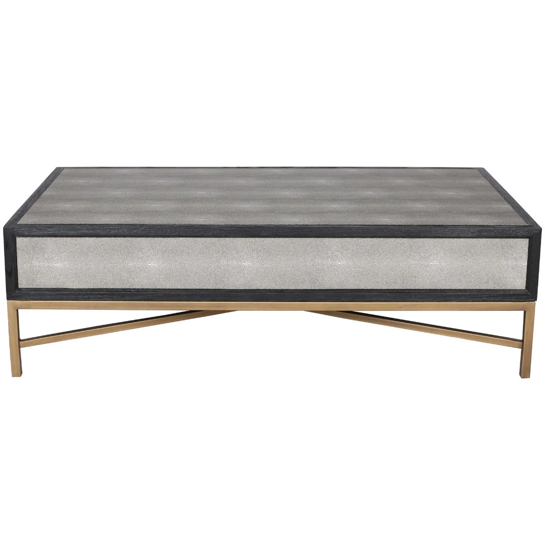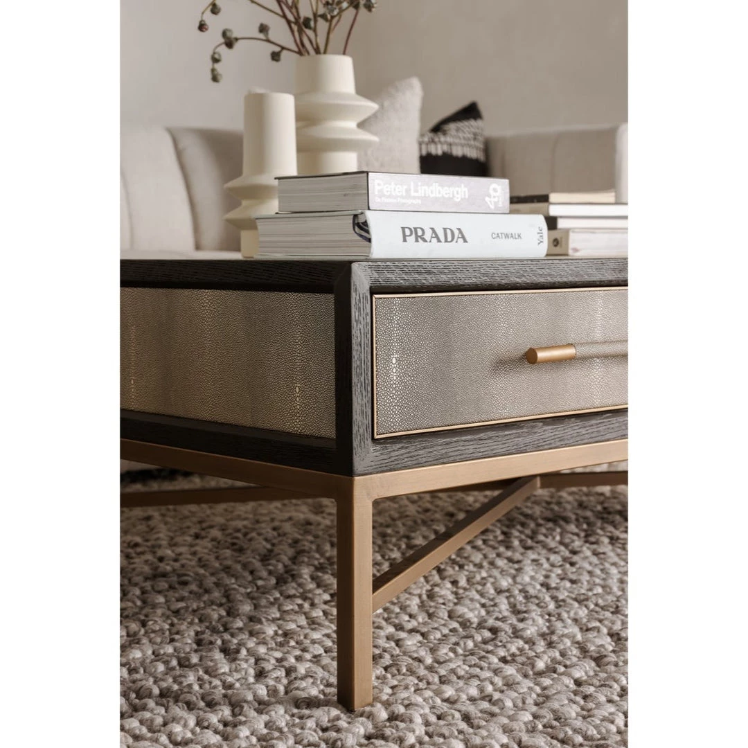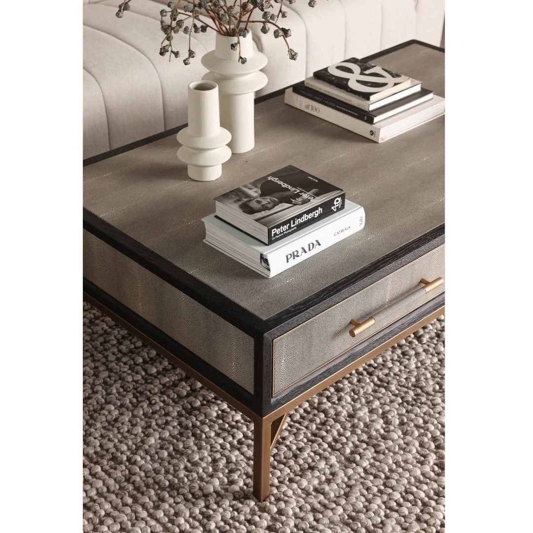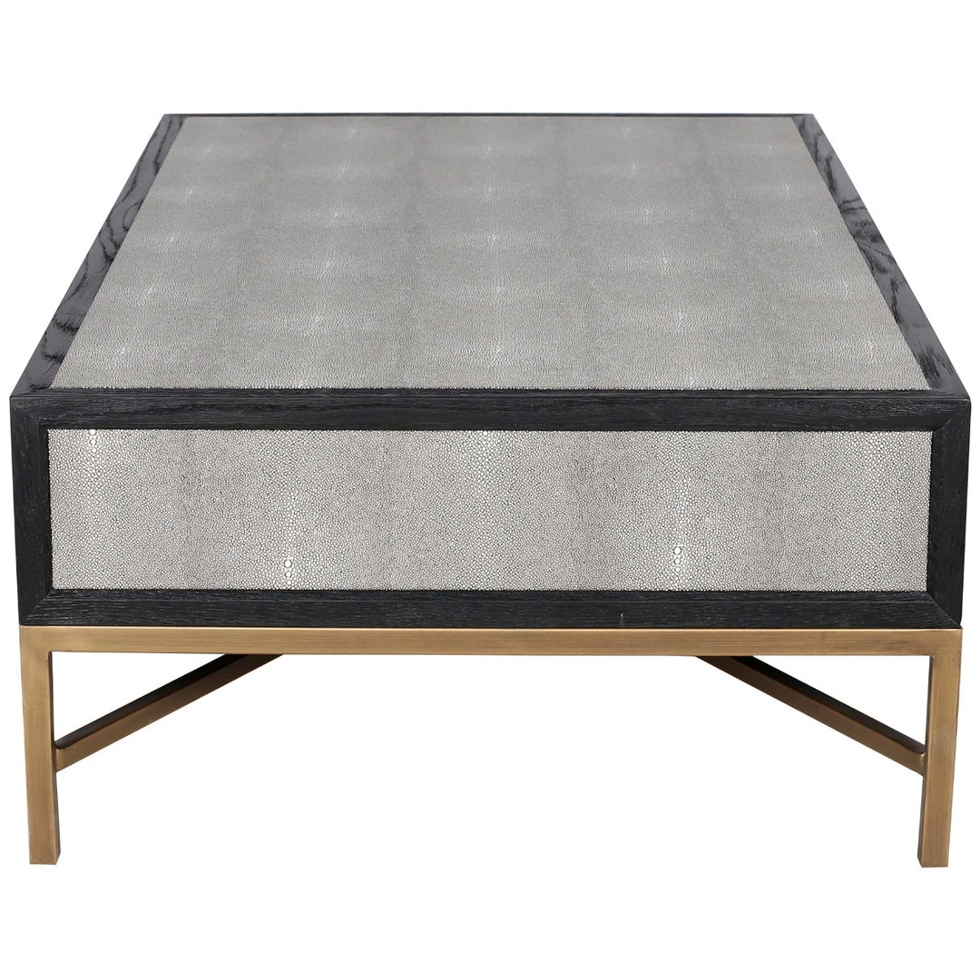 Solid oak wood construction. Contemporary design. The Mako Coffee Table features shagreen surfaces encased in a matt black lacquer frame with warm brass accents for an understated yet elegant look that transitions to any decor.