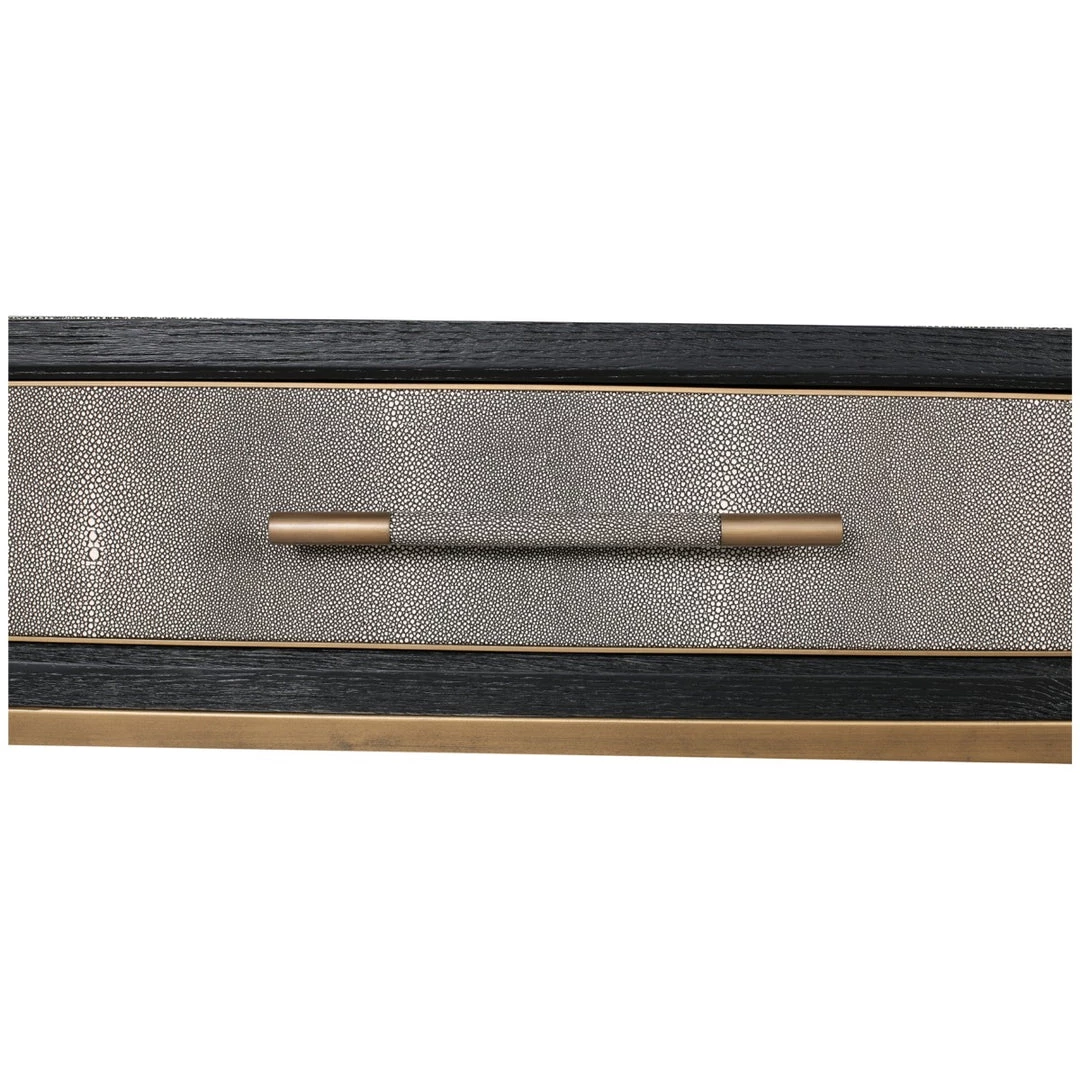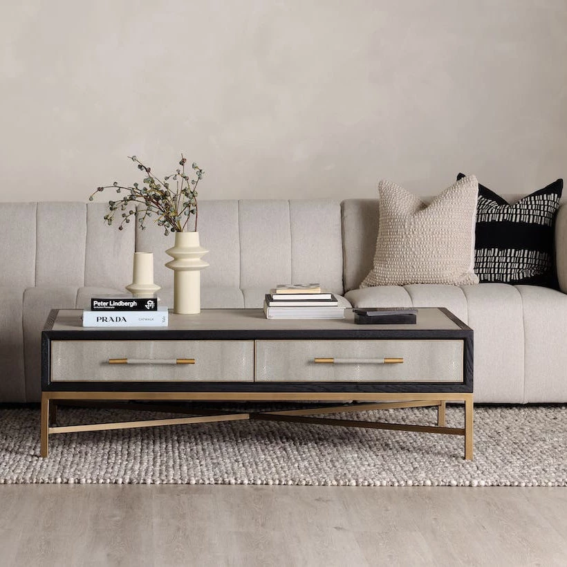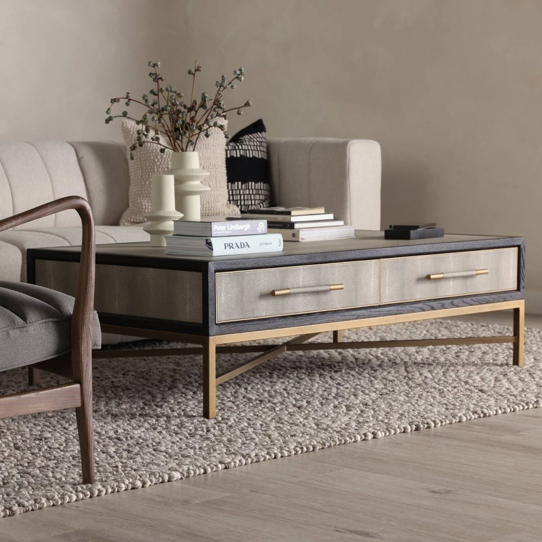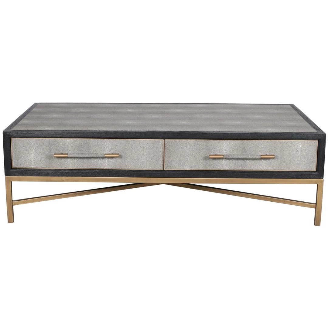 Solid oak wood construction. Contemporary design. The Mako Coffee Table features shagreen surfaces encased in a matt black lacquer frame with warm brass accents for an understated yet elegant look that transitions to any decor.