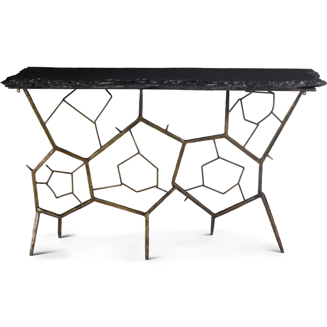 The Positano Slate Console Table is not for the faint of heart. This natural slate table features a dark, rough edge that shows off layers of rock, created slowly by the passing of time. An edgy, iron construction with a complimenting brass finish makes this is a fierce piece of furniture.
