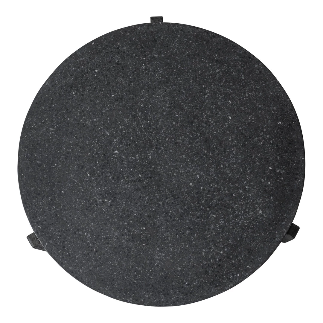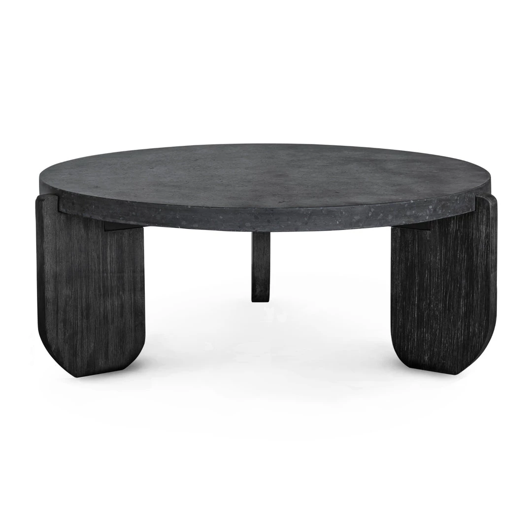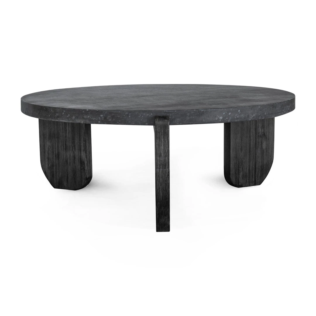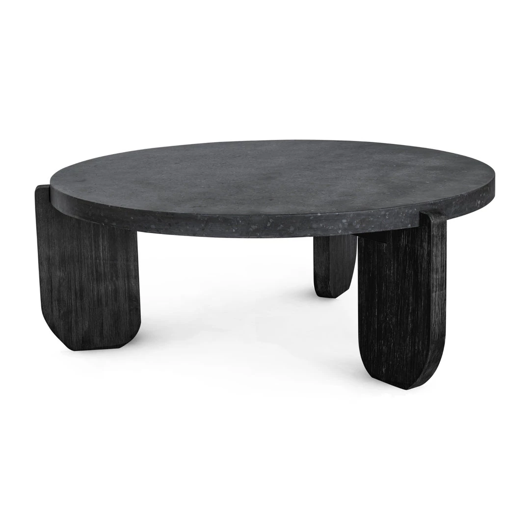 Ancient inspiration meets design innovation. Strikingly dark, the Wunder coffee table makes a monolithic statement in a low-profile silhouette. A round black terrazzo like concrete composite tabletop is perfectly matched by the organic texture and sturdy support of solid acacia legs.