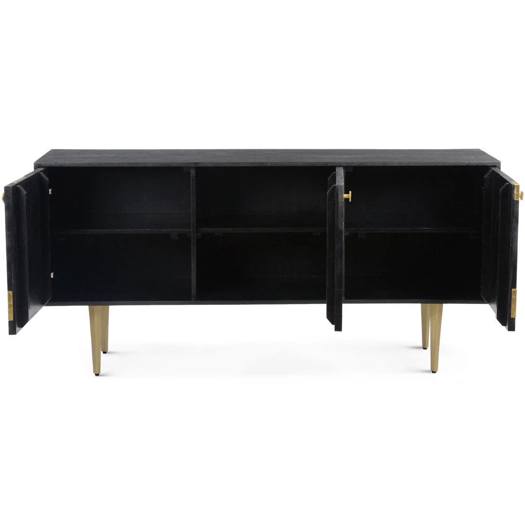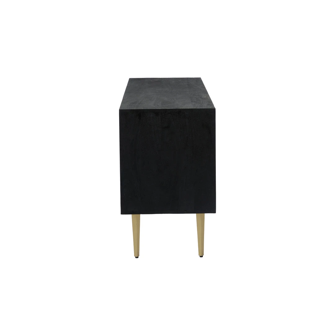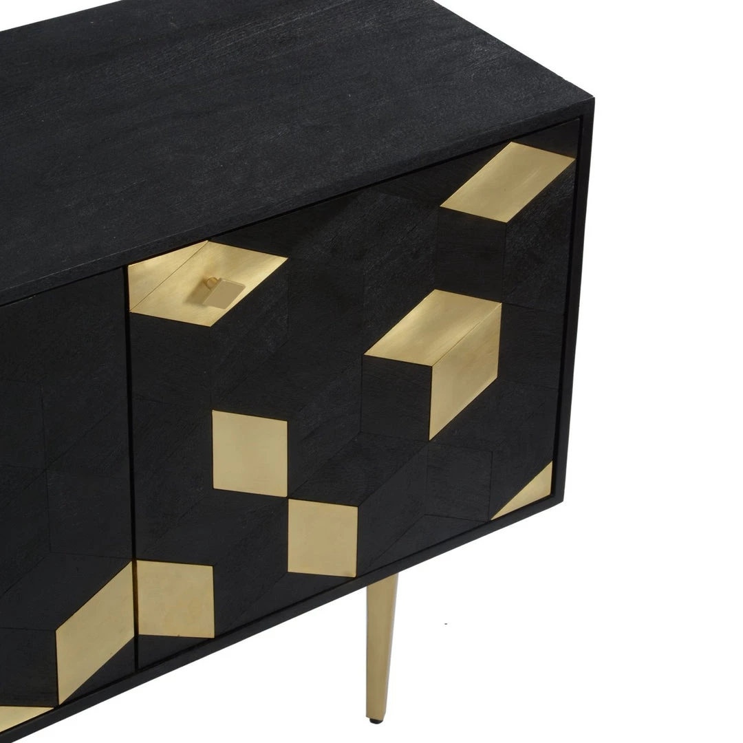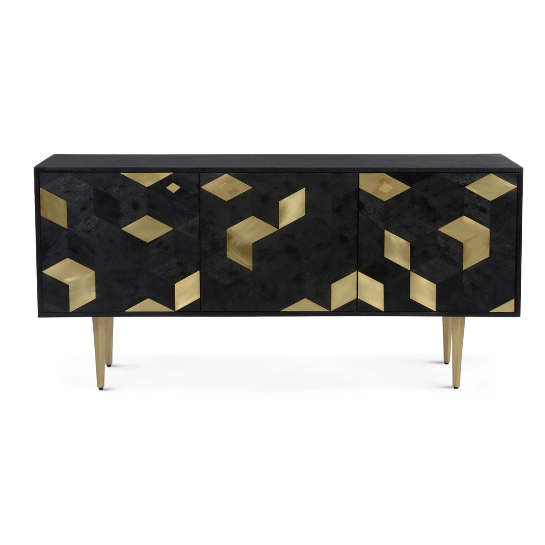 A sweet escape for all of your things, featuring darkened natural mango wood juxtaposed with geometric brass foil patterns for a creative look. With three swinging doors, this sideboard offers plenty of room to keep your home organized out of sight.