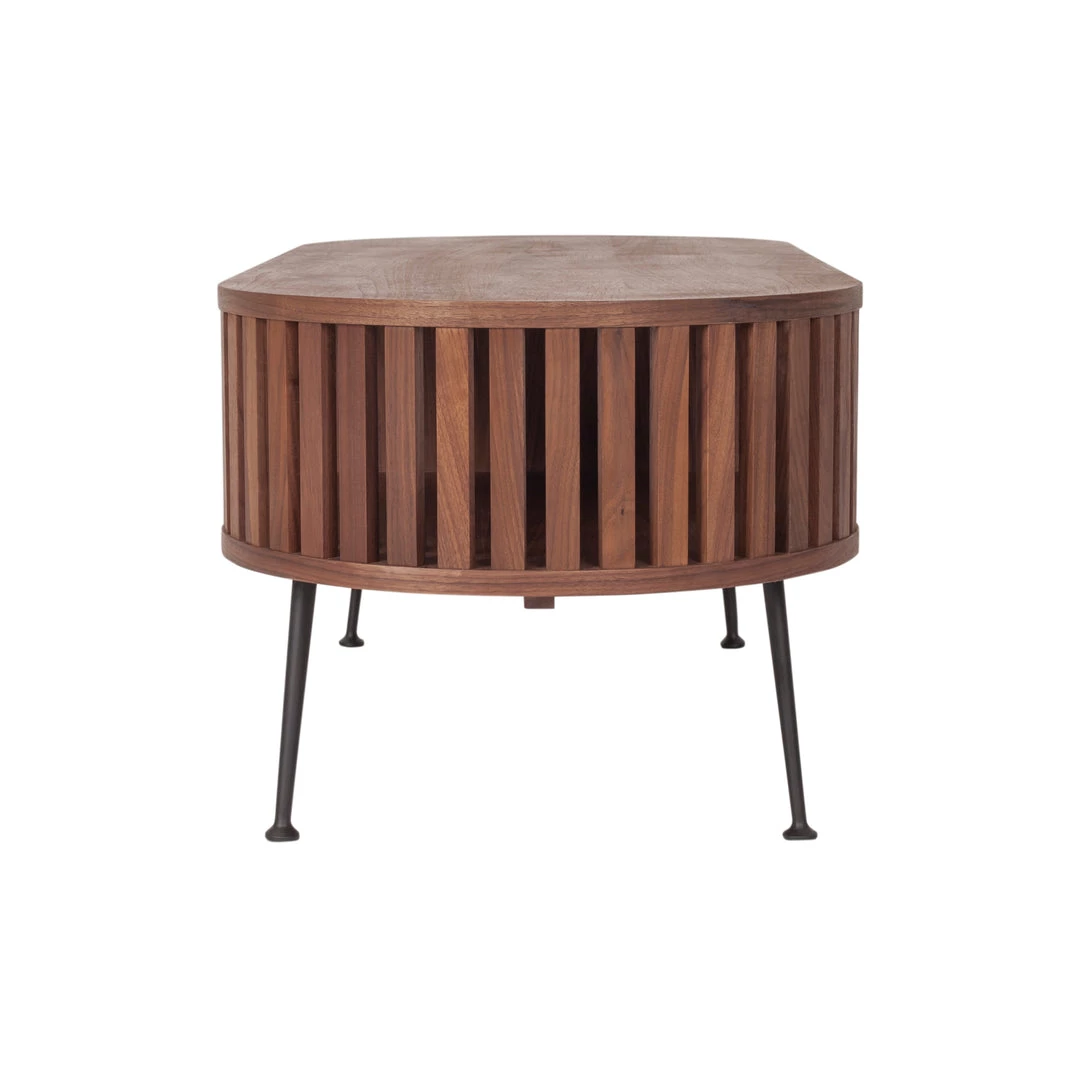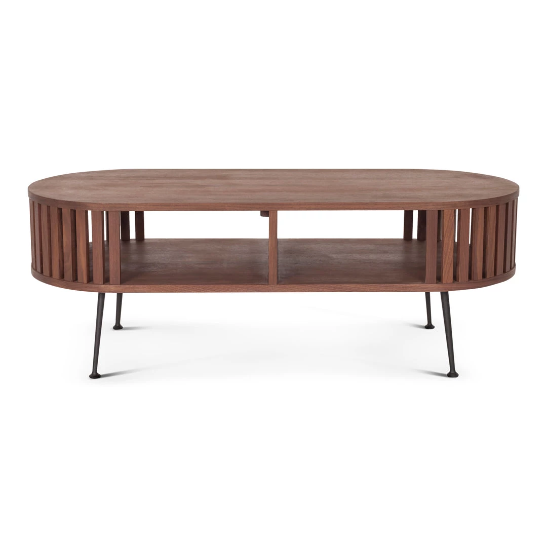 Featuring Mid-century modern style with gently rounded form and gated paneling that details its sides. This coffee table is designed with a solid walnut wood mixed with a slender, steel legs making it airy, yet simple. An open shelf is added to keep your essentials handy when needed.