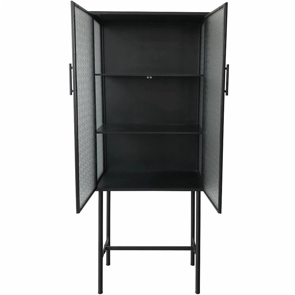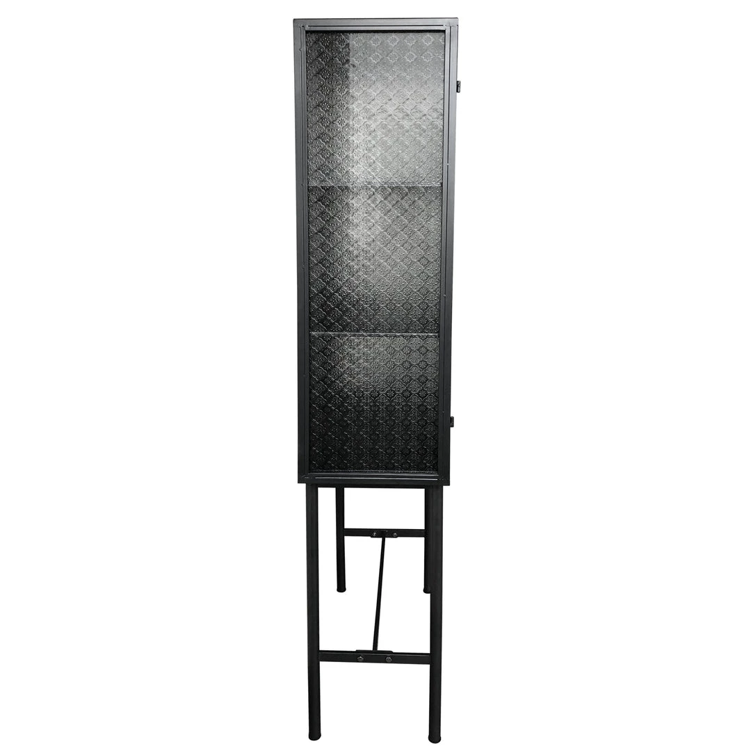 This industrial metal cabinet is a dark iron-and-glass affair. The two tall swinging glass doors have and embossed filigree design for a chic statement while two fixed interior shelves offer a sleek hideaway for your things.
