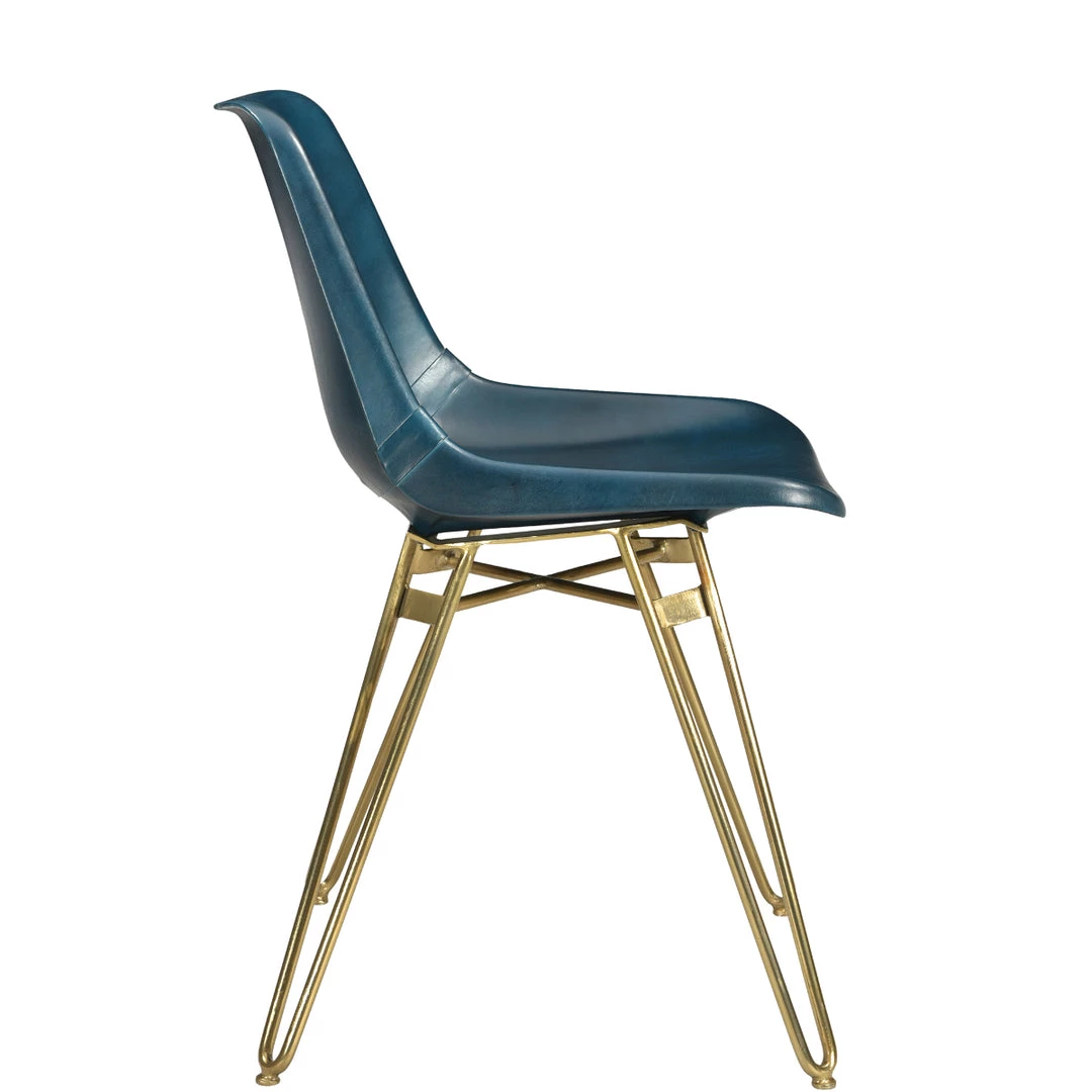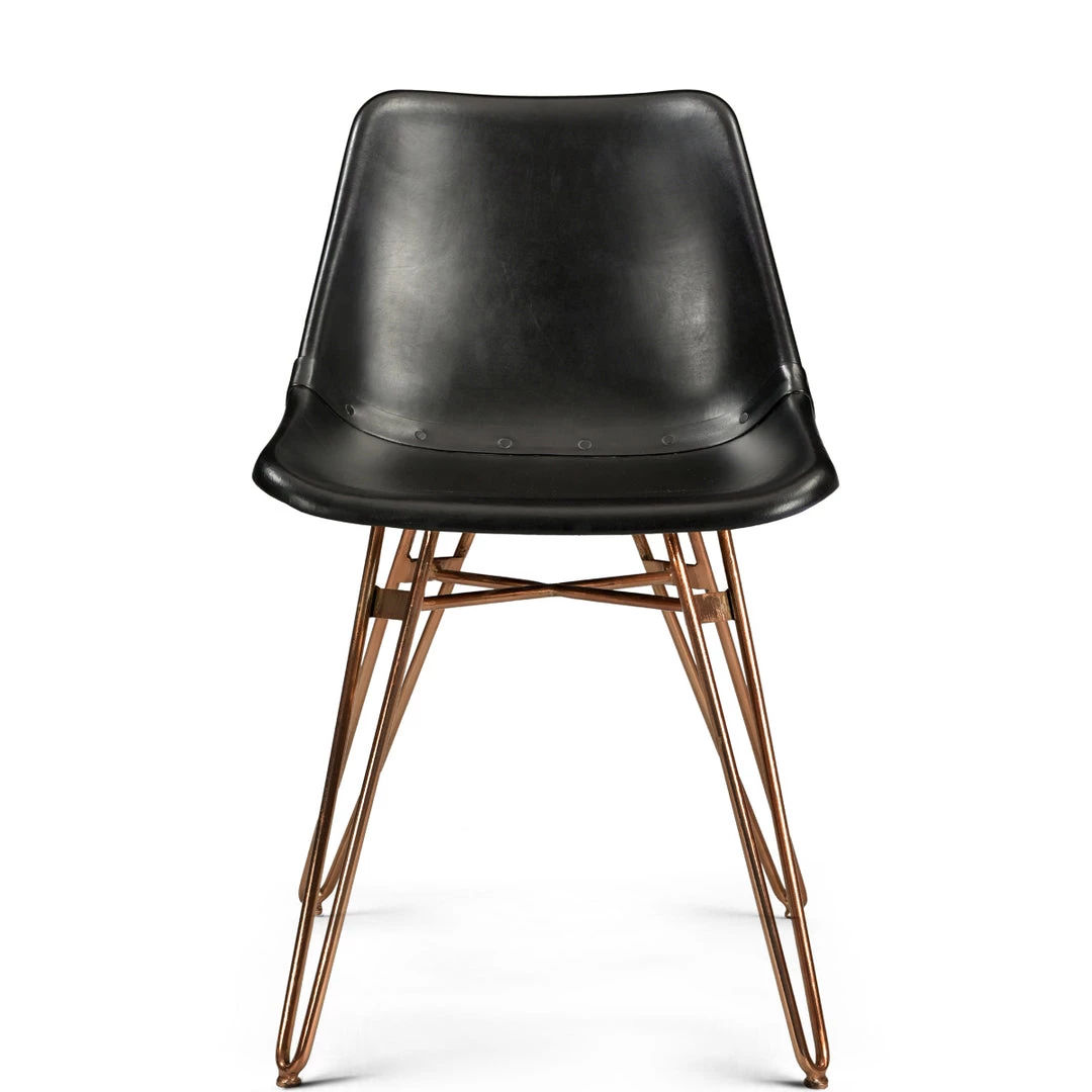 Rock-and-roll meets Mid-Century Modern with the Davidson Dining Chair. Covered in genuine goat leather with hide-like markings saddles a contoured seat with button strap detail. Set on a hand-welded powder coated star frame that flows continuous from base to seat.