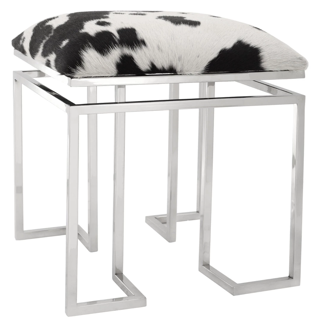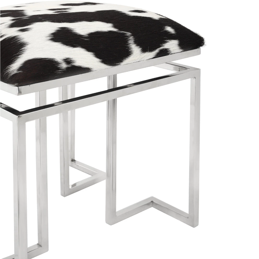 This modern stool combines unfinished cow hide on a slick stainless steel frame, for a cool designer style. Perfect as an accent or at a vanity or make-up table.