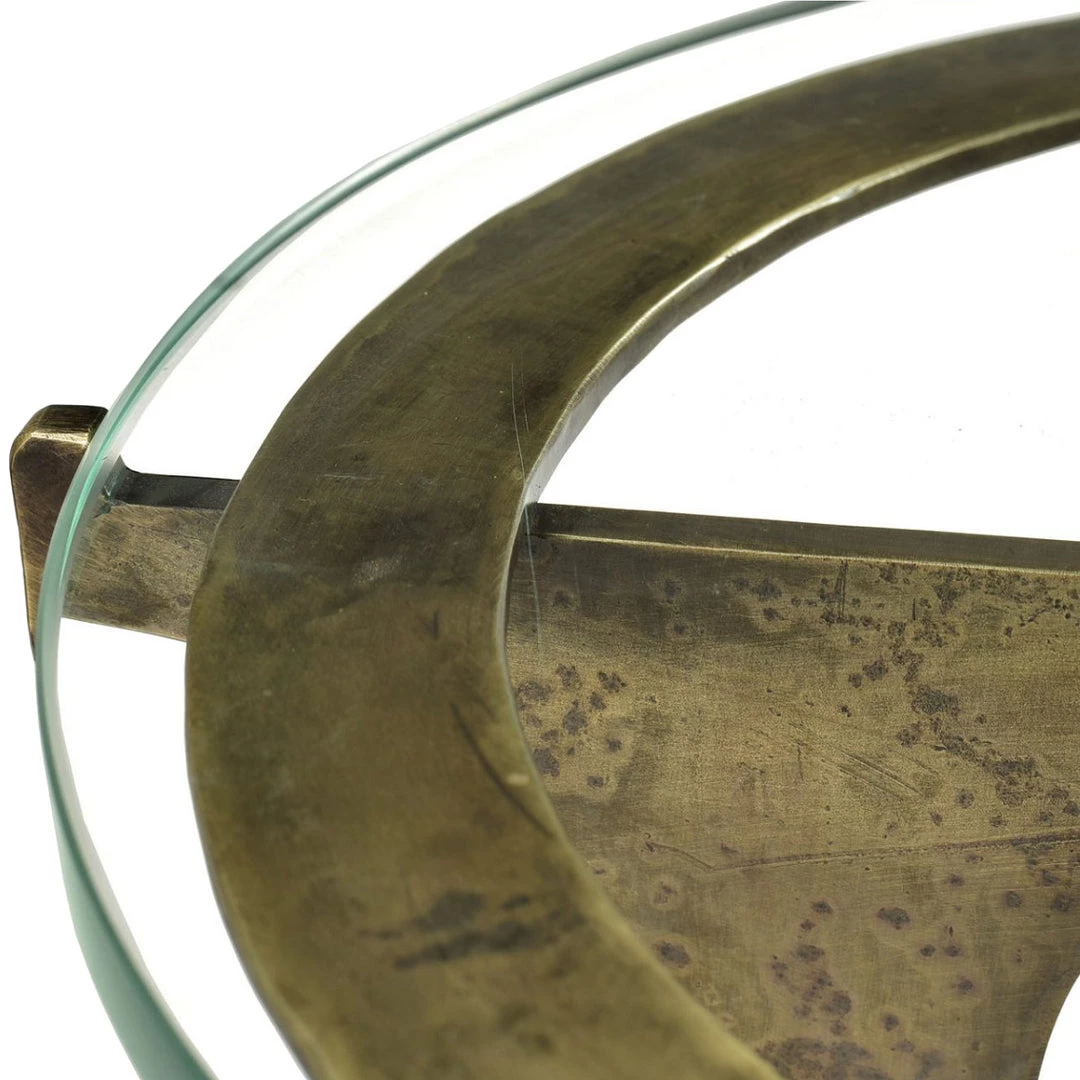 Made in an antique-brass finished iron, the Halvorsen has a glass top that shows off the cool metal work of this classy accent piece.