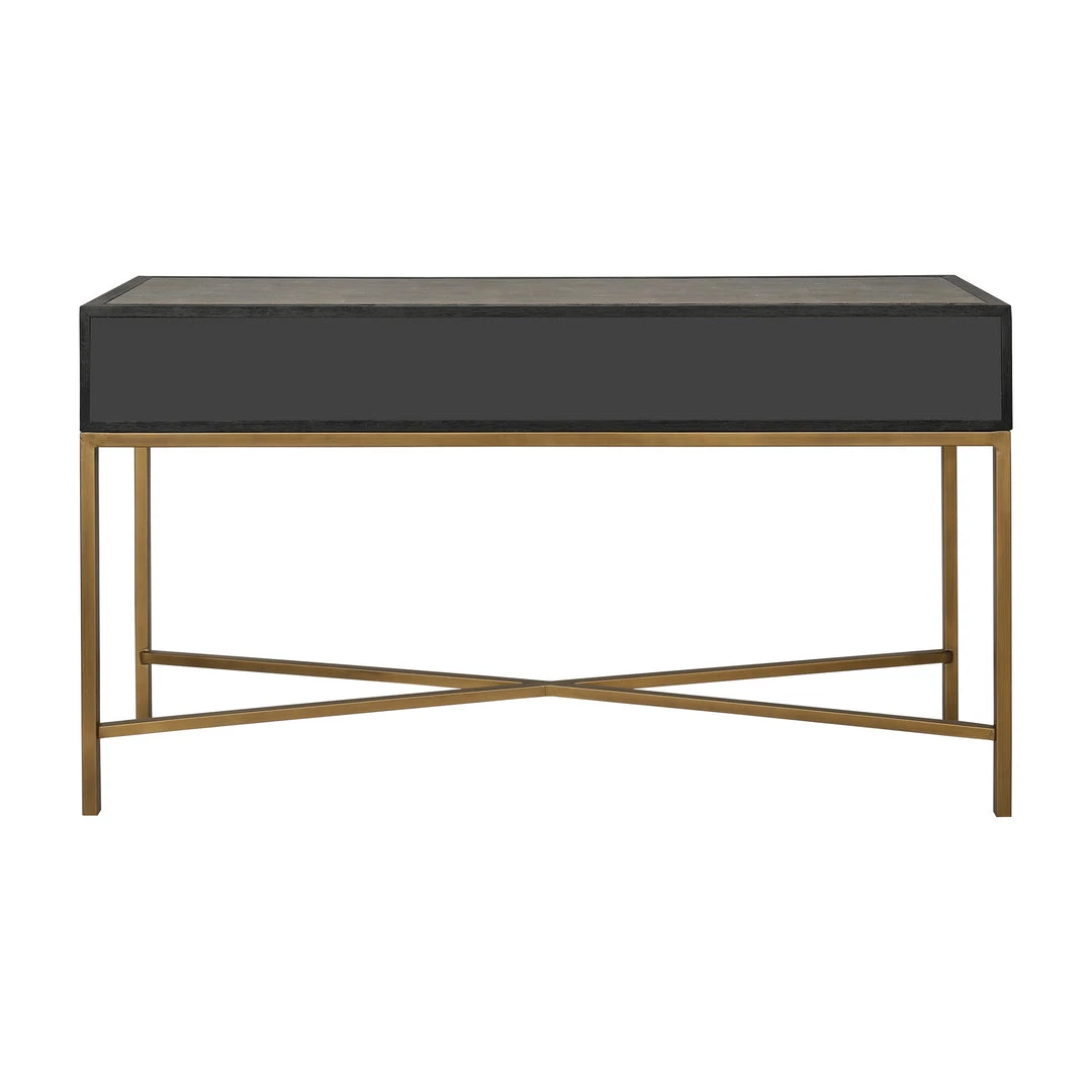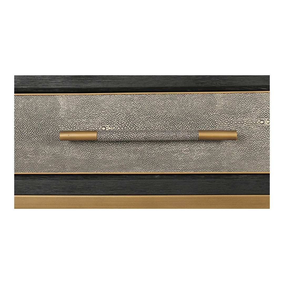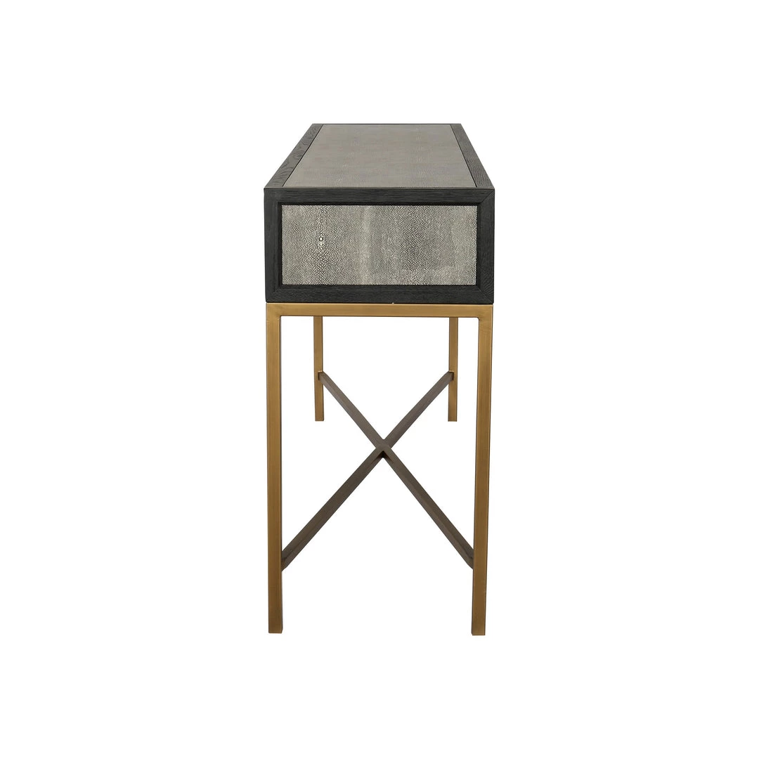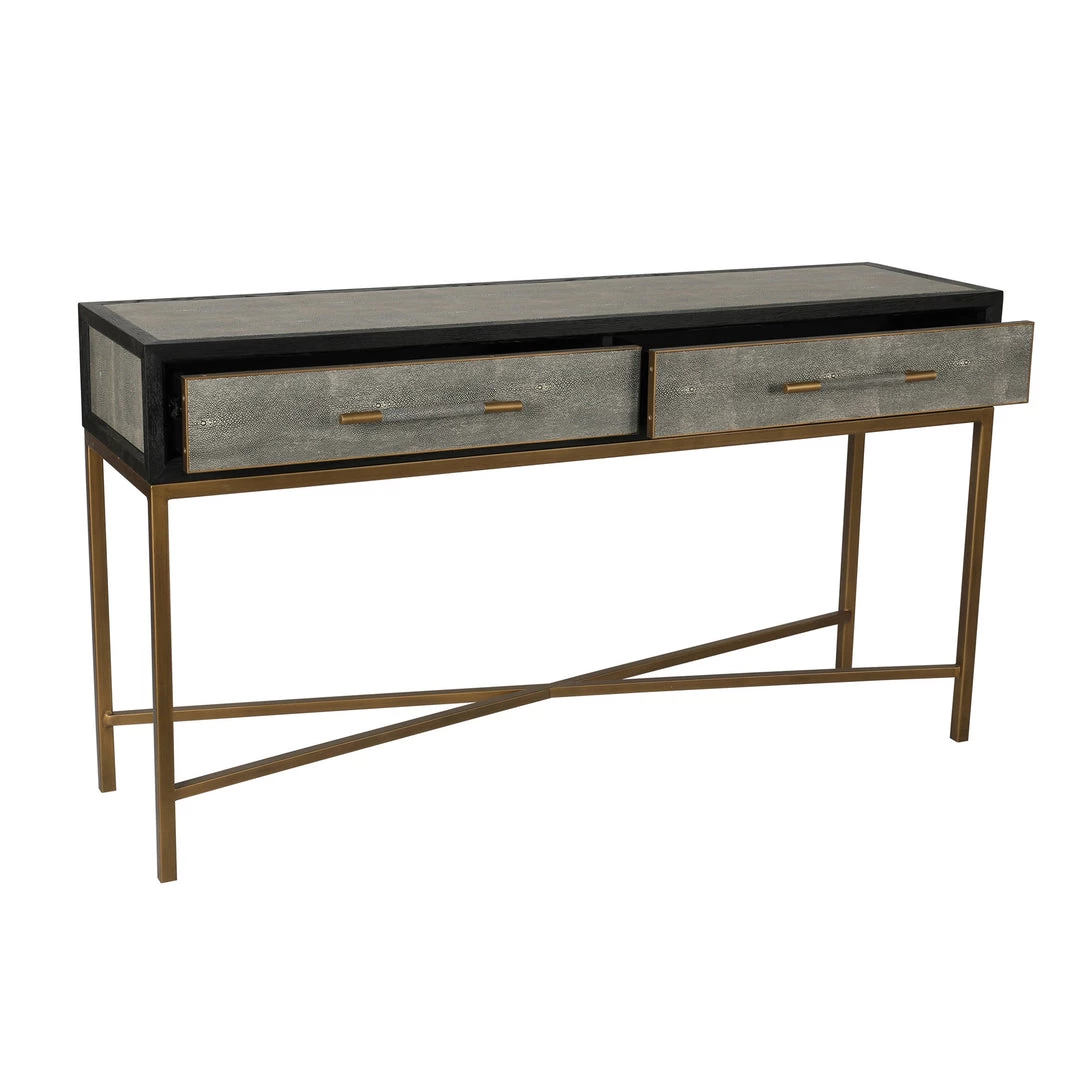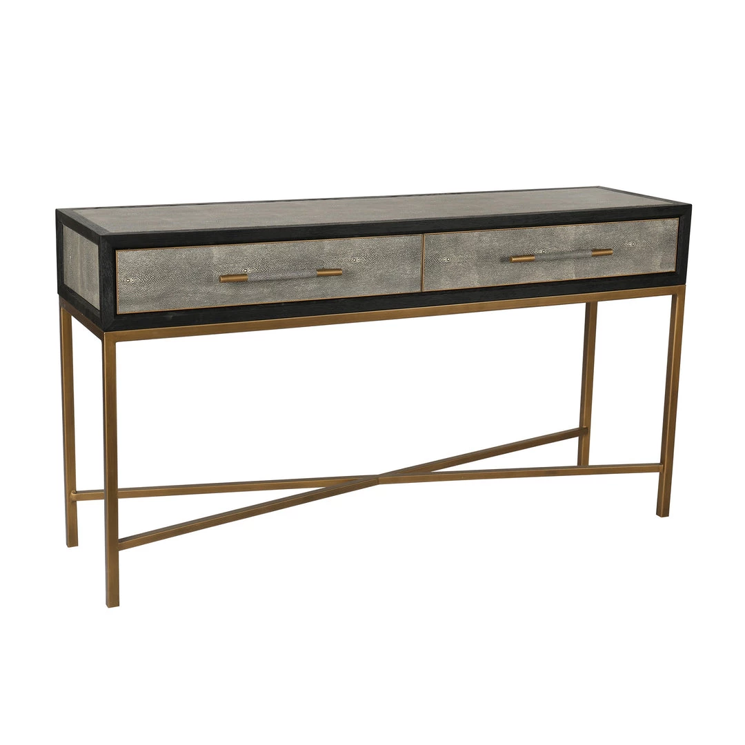 Solid oak wood construction. Contemporary design. The Mako consoles features shagreen surfaces accented with matt lacquer frame, warm brass legs, and handles for an understated yet elegant look that transitions to any decor
