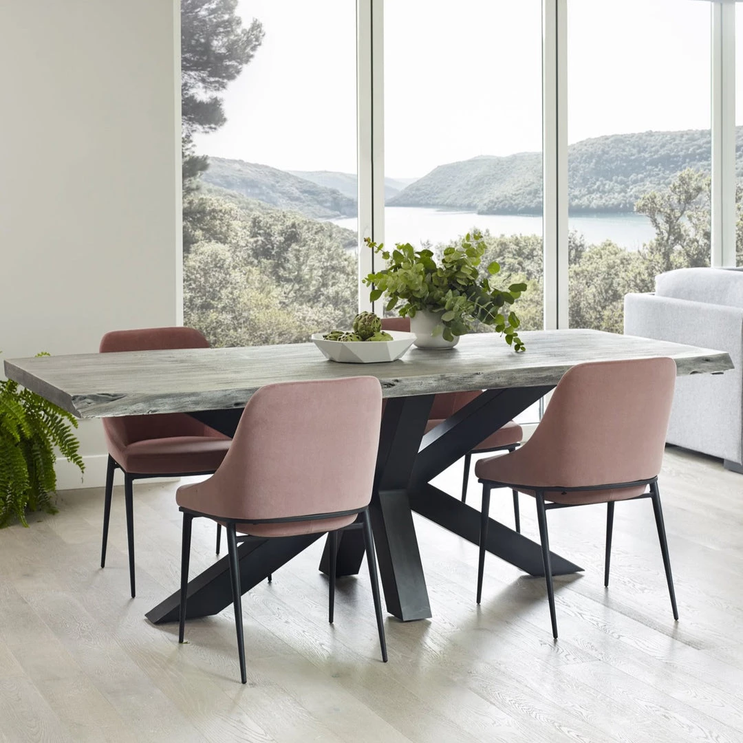 X marks the spot with Maxim Dining Table. A thick live edge slab of solid acacia wood brings a natural component to the grey stained wood while the geo-inspired solid iron base adds a contemporary modern twist.