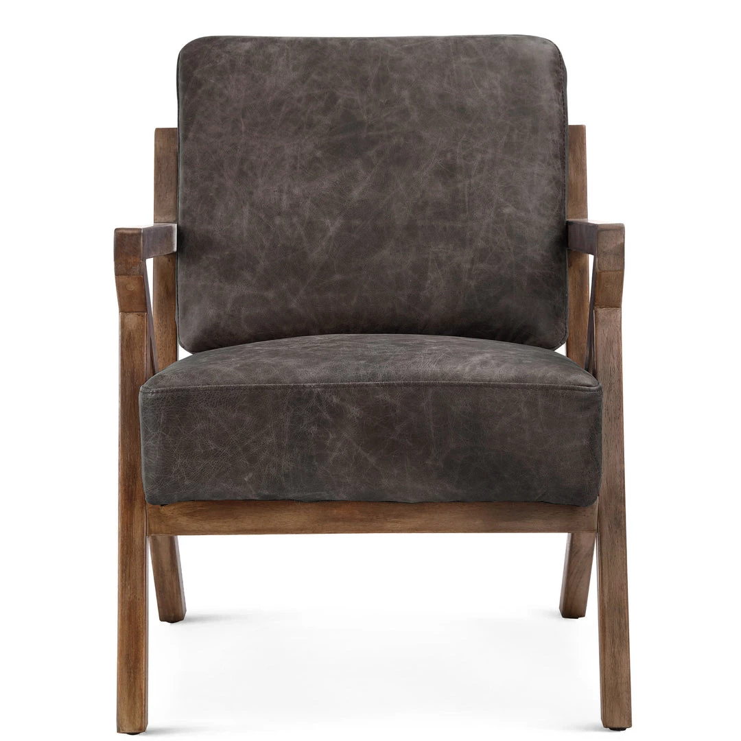 Relax in classic mid-century style and quality with this accent chair. An expertly-crafted, solid wood frame with rustic, 100% top-grain leather on its thick cushions. This chair might make you want to grab a decanter and a good book.