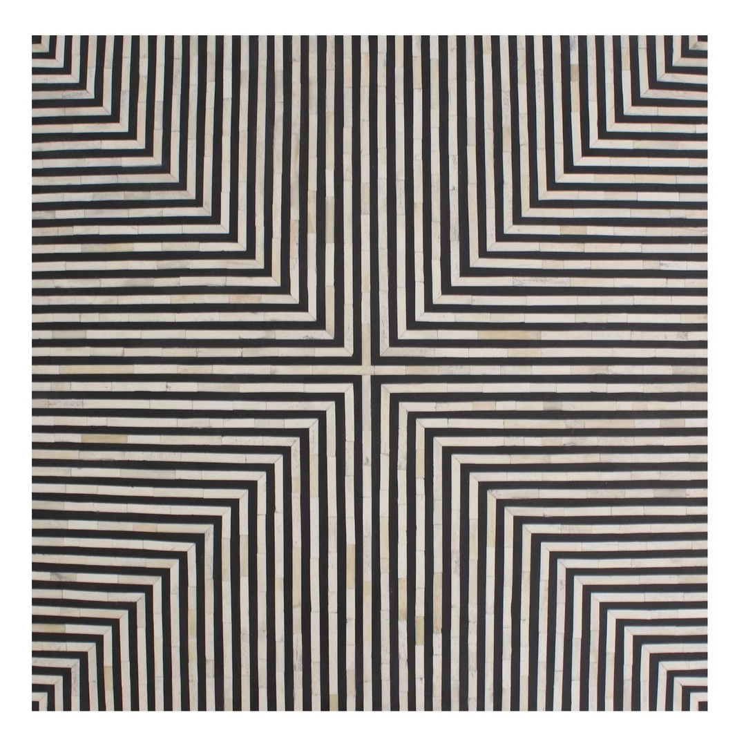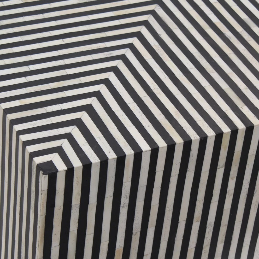 Simplistic and bold, this block coffee table’s hypnotic art deco design is an exercise in contrast. A veneer of ethically sourced white and black camel bone with resin adds a visual statement that contrasts with its simple construction and square shape.