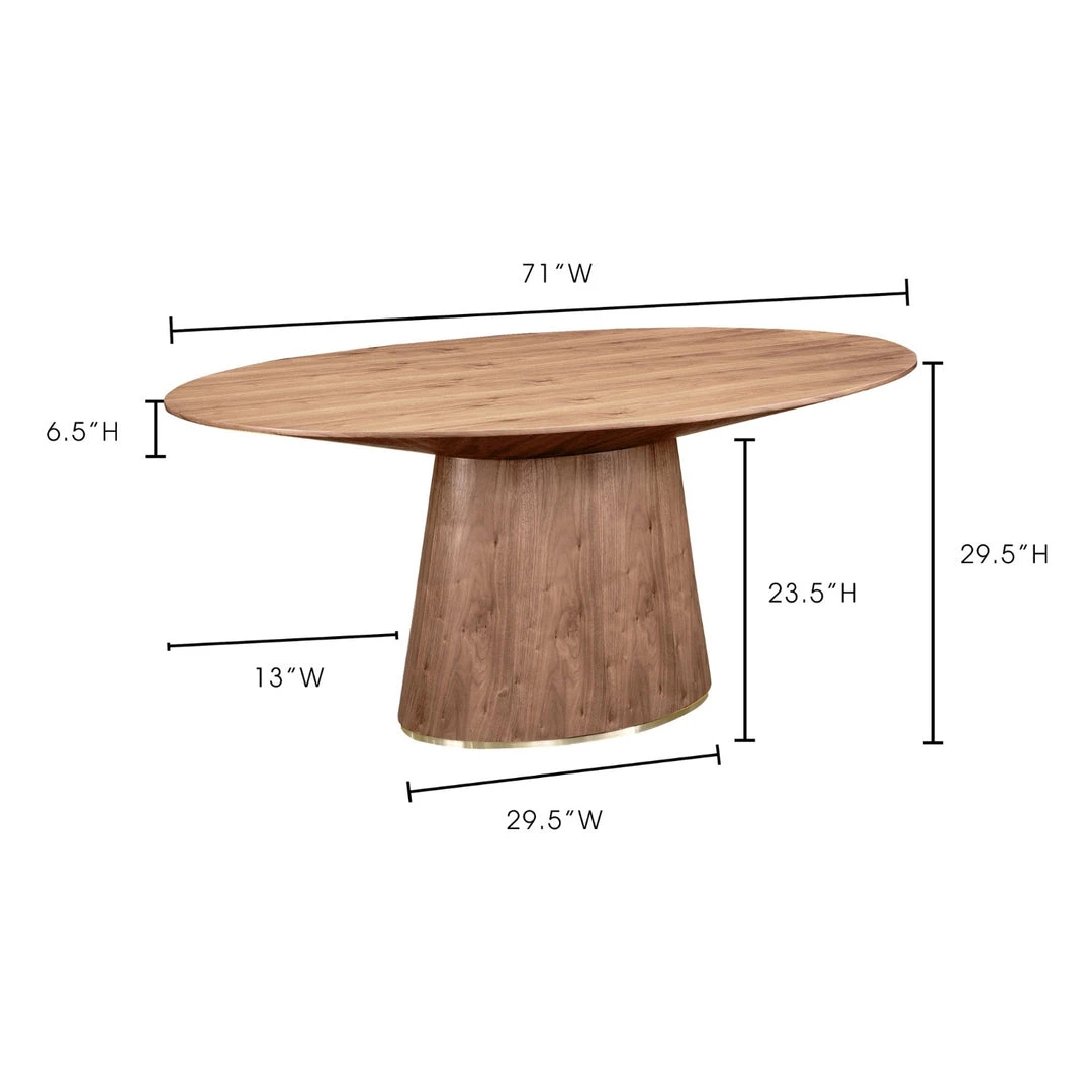 Perfect for the classic modernist. Nestled on top of a walnut pedestal, the Otago Table features clean lines and a contemporary style that will brighten up your dining area with its warm hues and oval design. A rich walnut veneer, and brushed stainless steel detailing complete this tables seamless look.