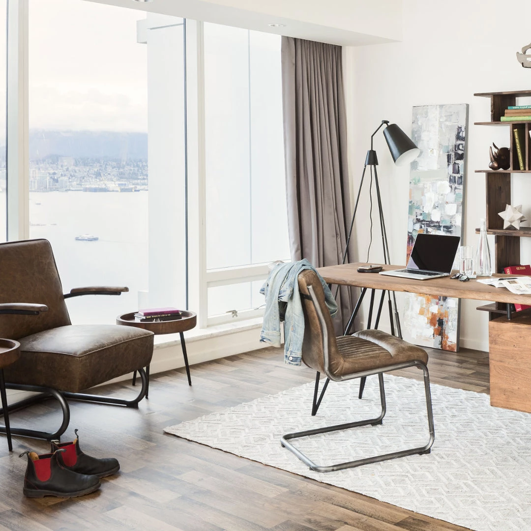 Modern style arm club chair, with contemporary design. Made from distressed leather, and metal frame.