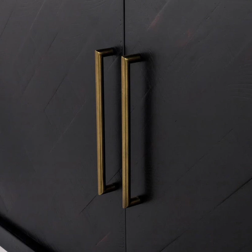 The Sicily Collection is a modern design with a bit of rustic and industrial styling thrown in. Ebony finished, solid acacia planks in an angular design with wide legs and metal hardware detailing. Note: Panels and tops are solid acacia set on MDF to allow the patterned tops to be constructed and to prevent cracking.