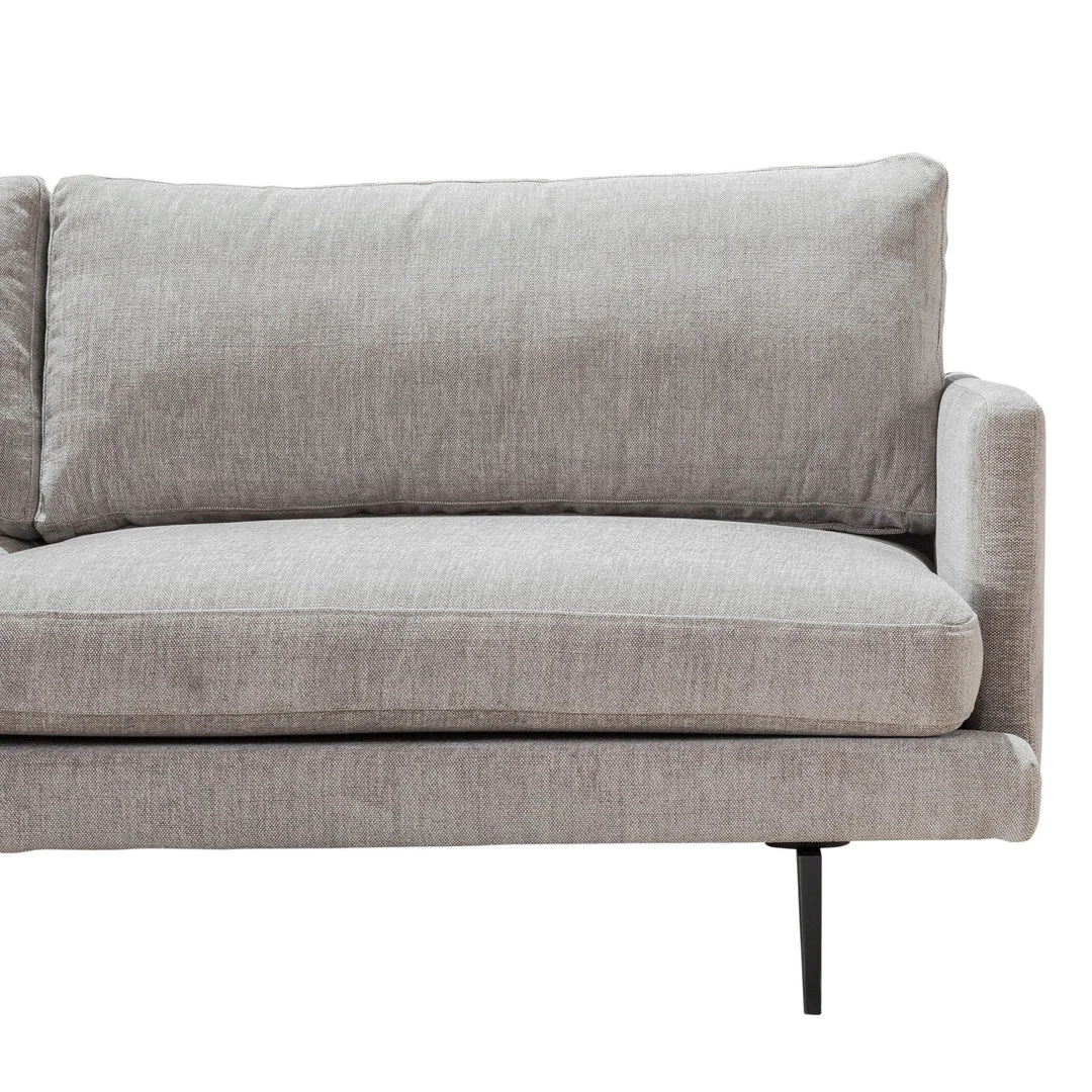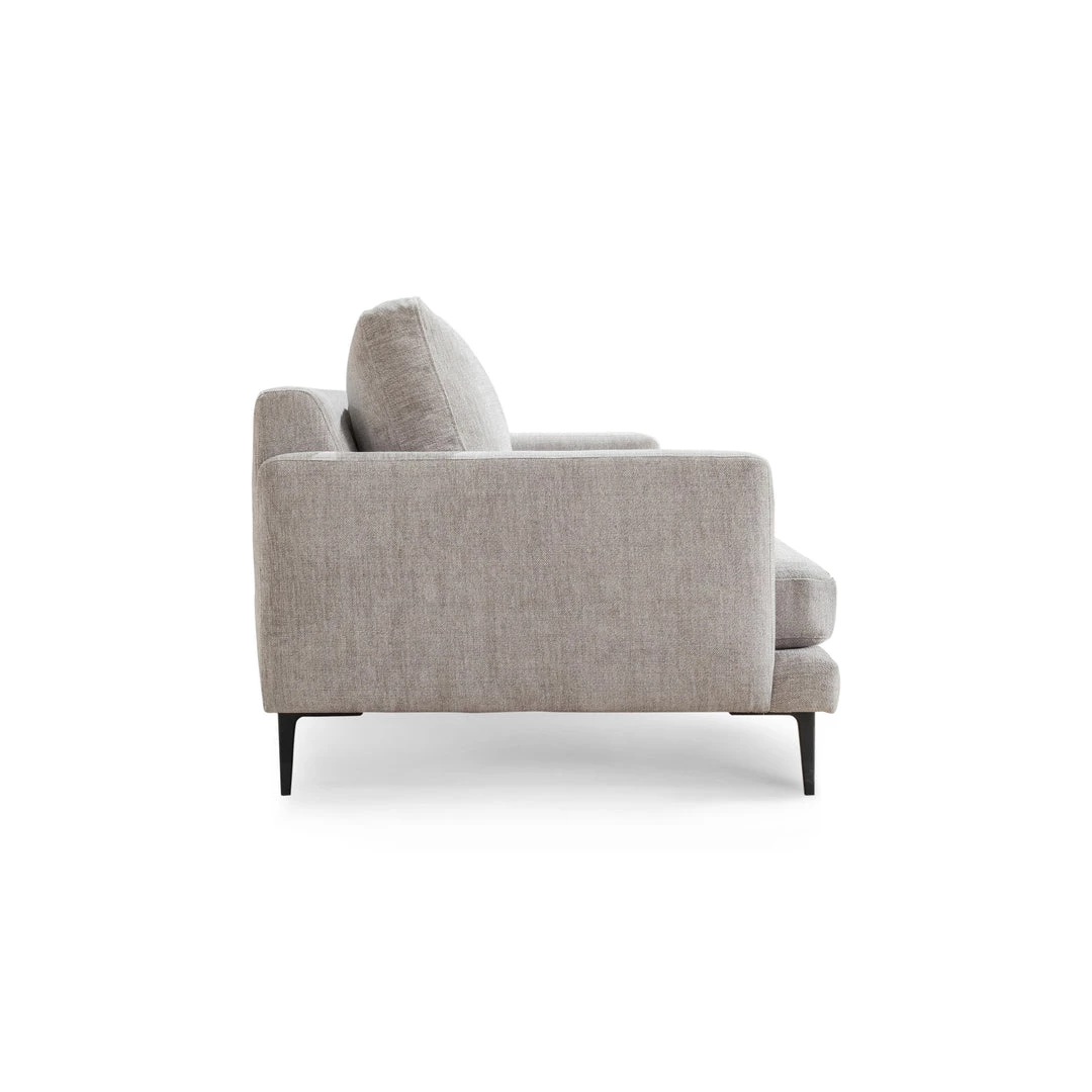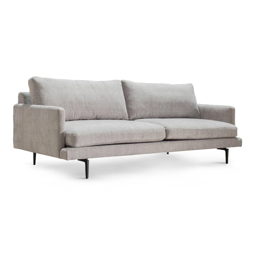 Modern-minimalist design and soft seating merge to offer tailored style and lush comfort. Slim black steel legs and inviting neutral grey textural upholstery make this perfectly stylish sofa prime for lounging.