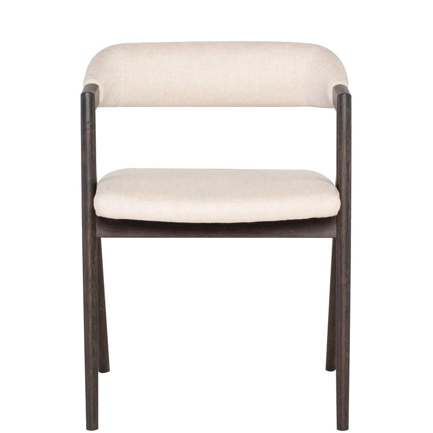 Clean cut lines create a strong frame for the Anita dining chair. The chair’s solid oak legs are slightly angled, forming an intriguing profile. A soft fabric seat and back add comfort and contrast to the strong wood details.