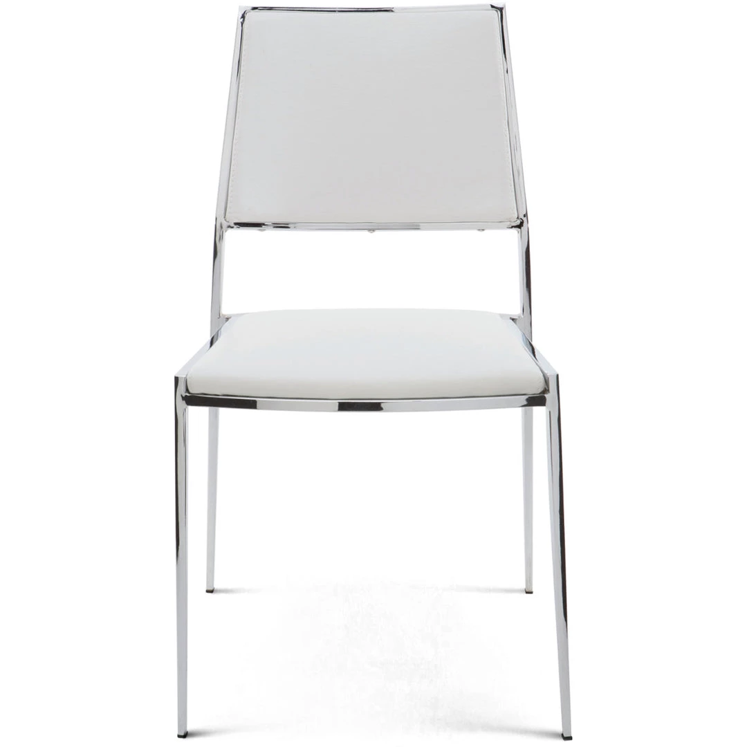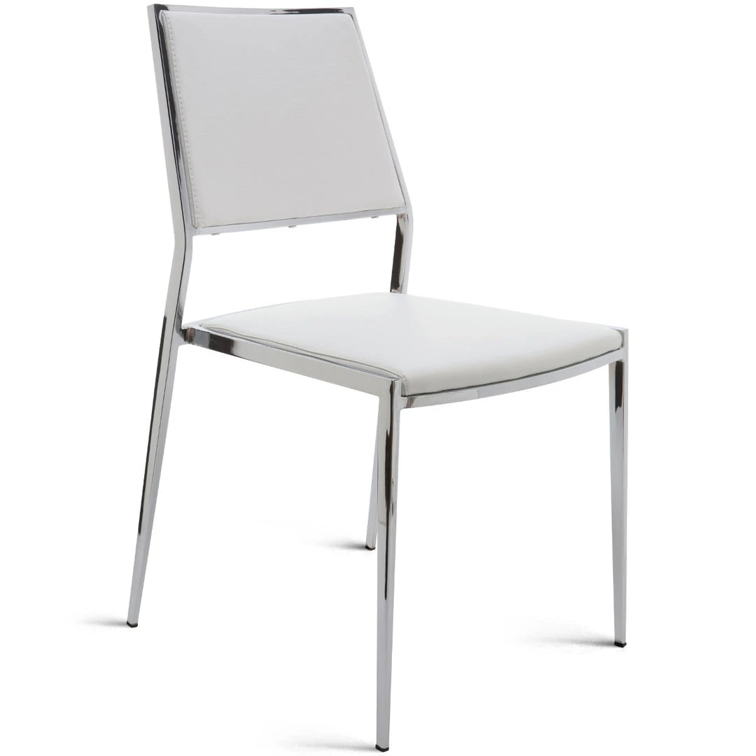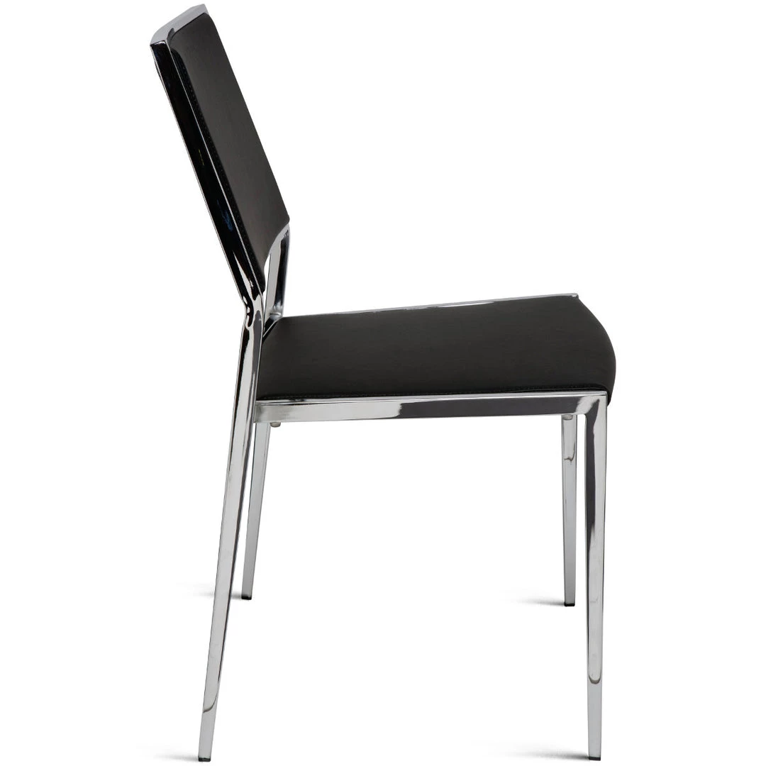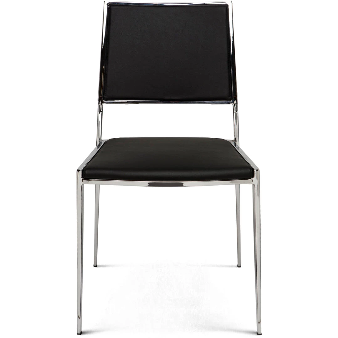 The Chroma dining chair is combines polished chrome and supple naugahyde on a geometric frame that provides comfort with a streamlined modern style. This clean, versatile, contemporary chair is built to last. Suitable for any installation whether commercial or residential.