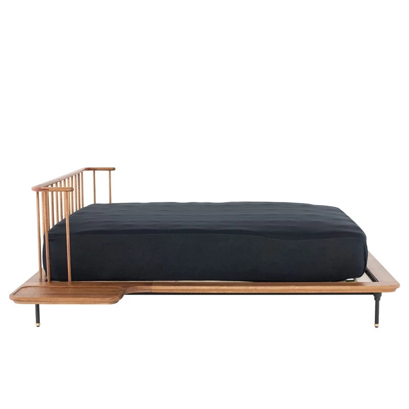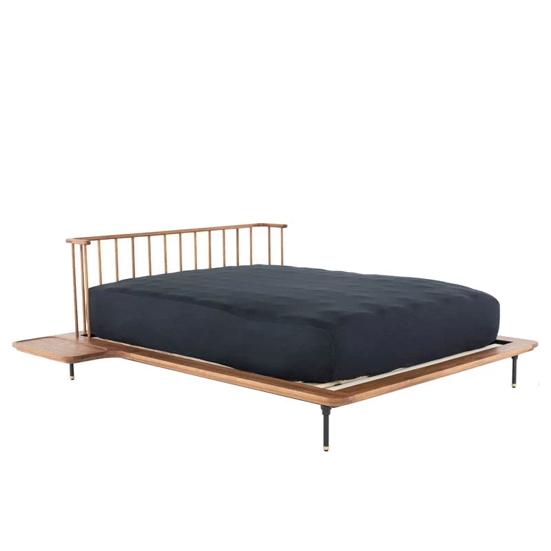 A timeless mid-century design, the Distrikt Platform Bed is made from solid hard-fumed oak with carved and rounded ends. Solid oak construction with African padouk joinery details command attention while remaining versatile in composition leaving ample room. A solid steel base finished with brass levelers ensure a great sleep in style while a built-in table on each side provides convenient space for a lamp, alarm clock and other essentials.