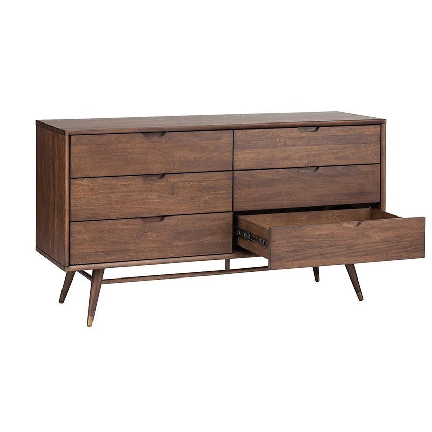 Notable for its refined early-modern lines, the Daniel dresser drawer is a fine interpretation of classic mid-century design. The six drawer hardwood dresser is fitted with soft close hardware and elegant turned wood legs featuring brass leg caps. The Daniel is constructed using American Poplar hardwood.