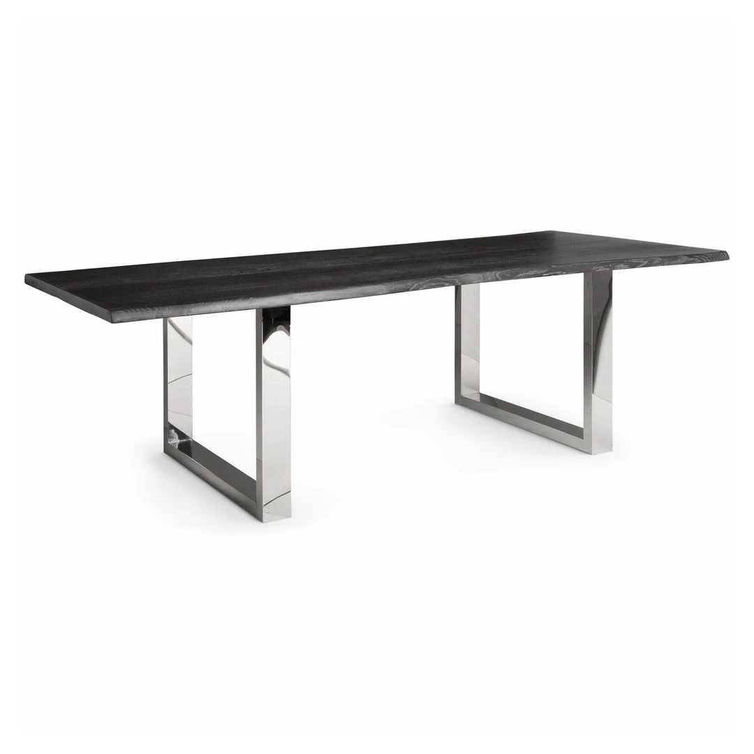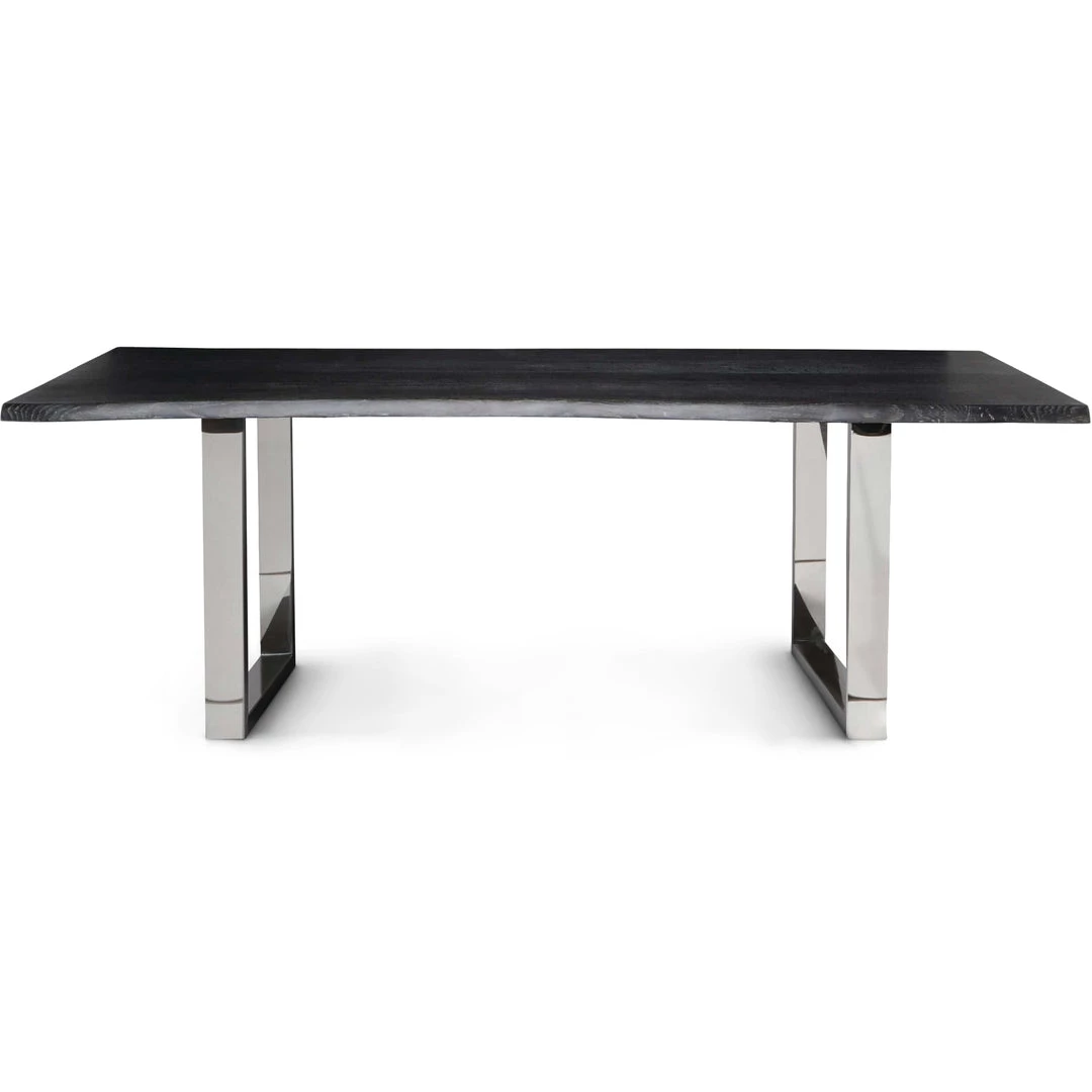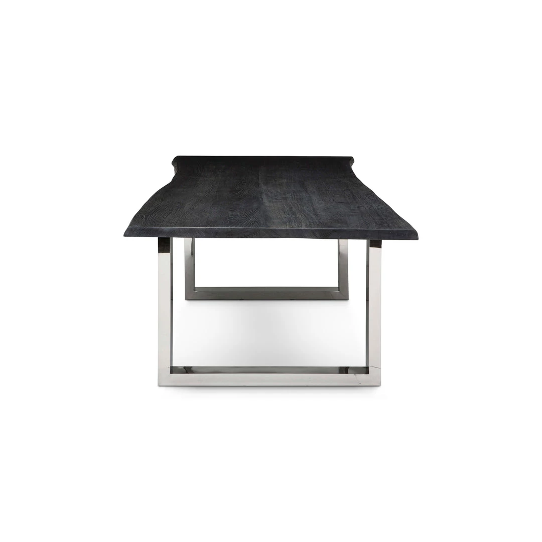A bold contrast presenting a distinguished modern aesthetic. The Luxor table’s solid live edge French oak table top in an oxidized grey finish rests on ultramodern high polish stainless steel u-legs projecting a grand sculptural contemporary narrative.