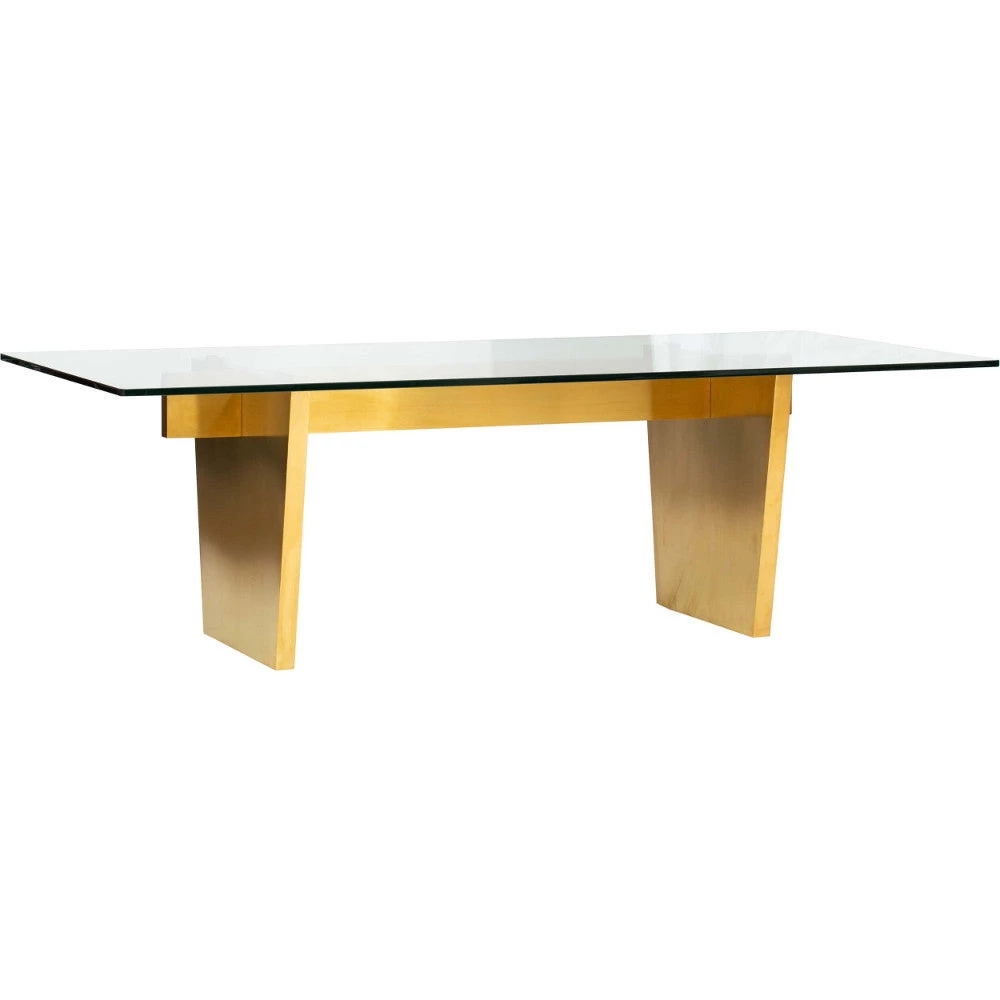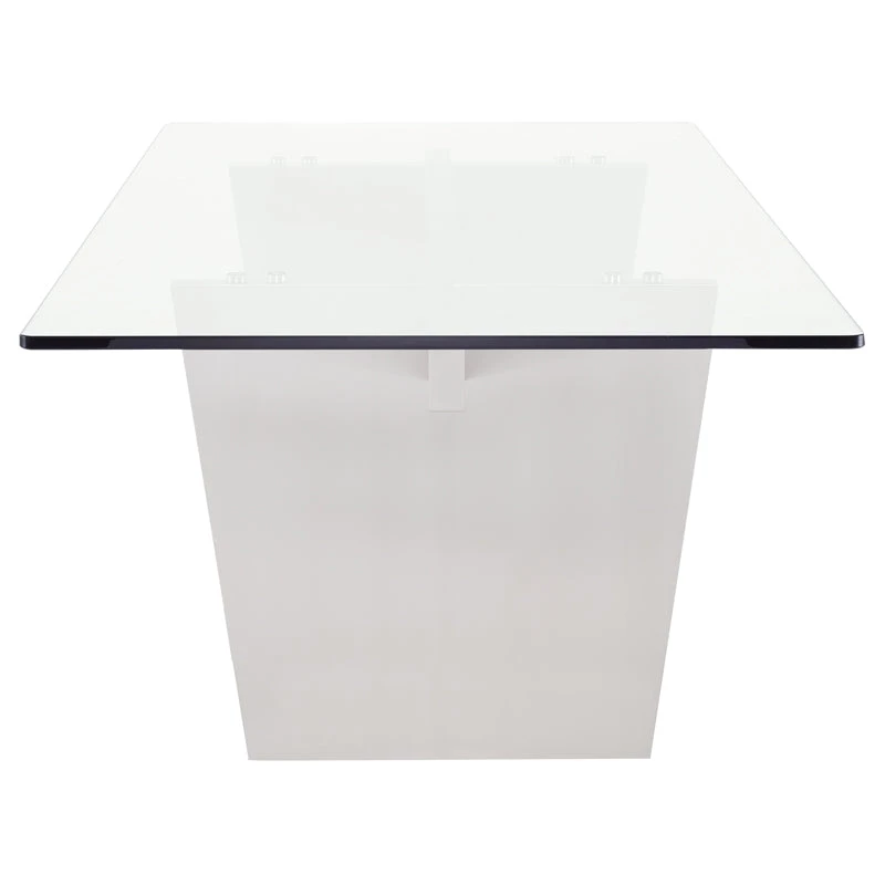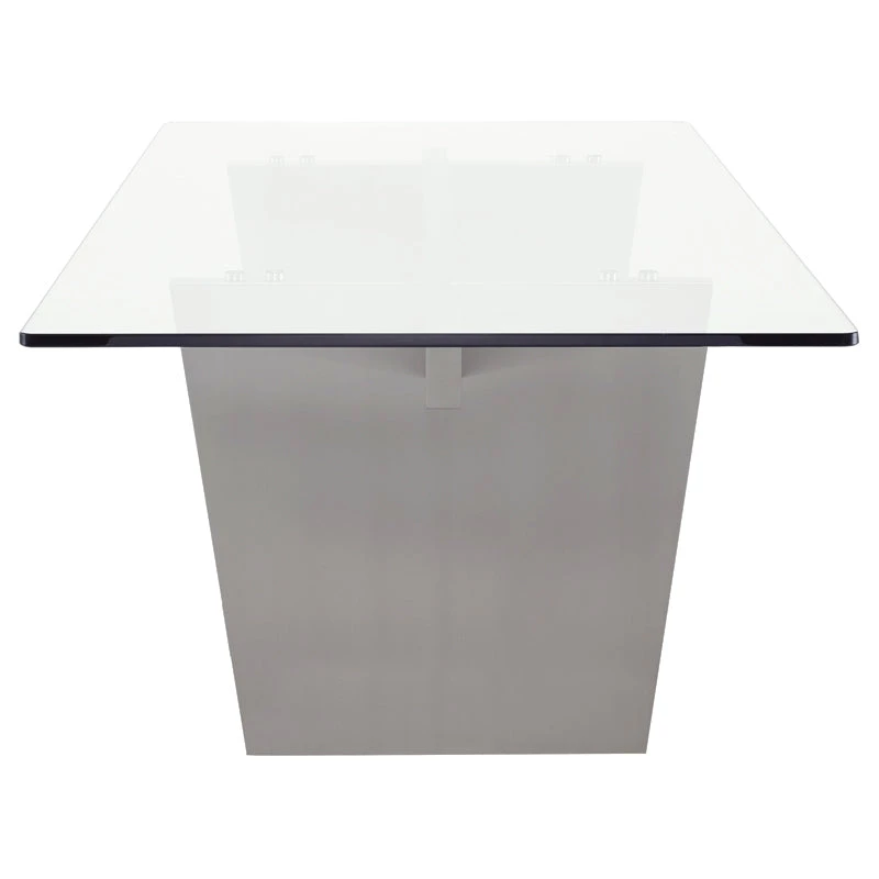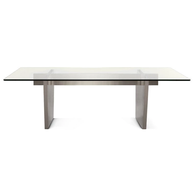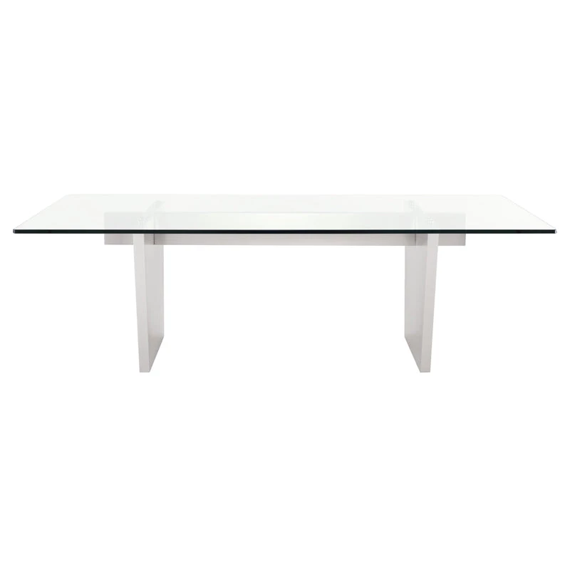 Architecturally inspired, the Aiden dining table features an elegantly simple clear tempered glass table top set on an iconic modern post and beam inspired steel base. The seamless pairing of glass and steel projects a grand sculptural contemporary narrative.