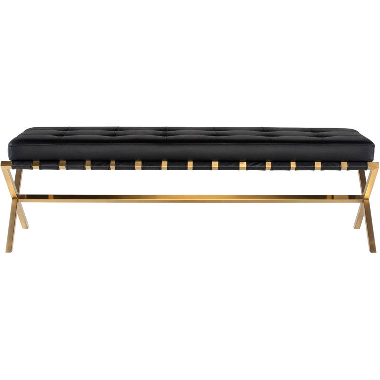 The Auguste bench is perfect in any entryway or at the foot of a bed. An X shaped stainless steel frame wrapped with saddle leather strapping supports a tufted Naugahyde leatherette cushion running the full length of the bench.