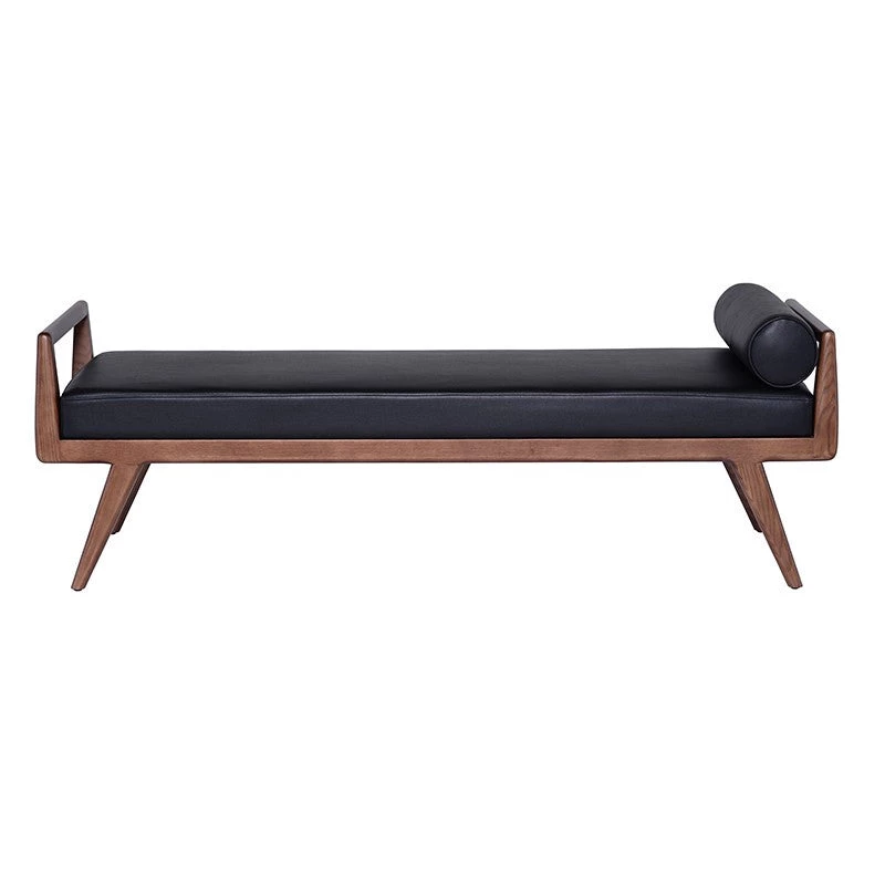 An elegant frame crafted in ash stained walnut the Ava occasional bench blends classic elements with a modern paired down aesthetic. Smartly tailored, padded black naugahyde upholstery is neatly integrated into the body of the Ava, an end pillow provides added comfort and a graceful finish.