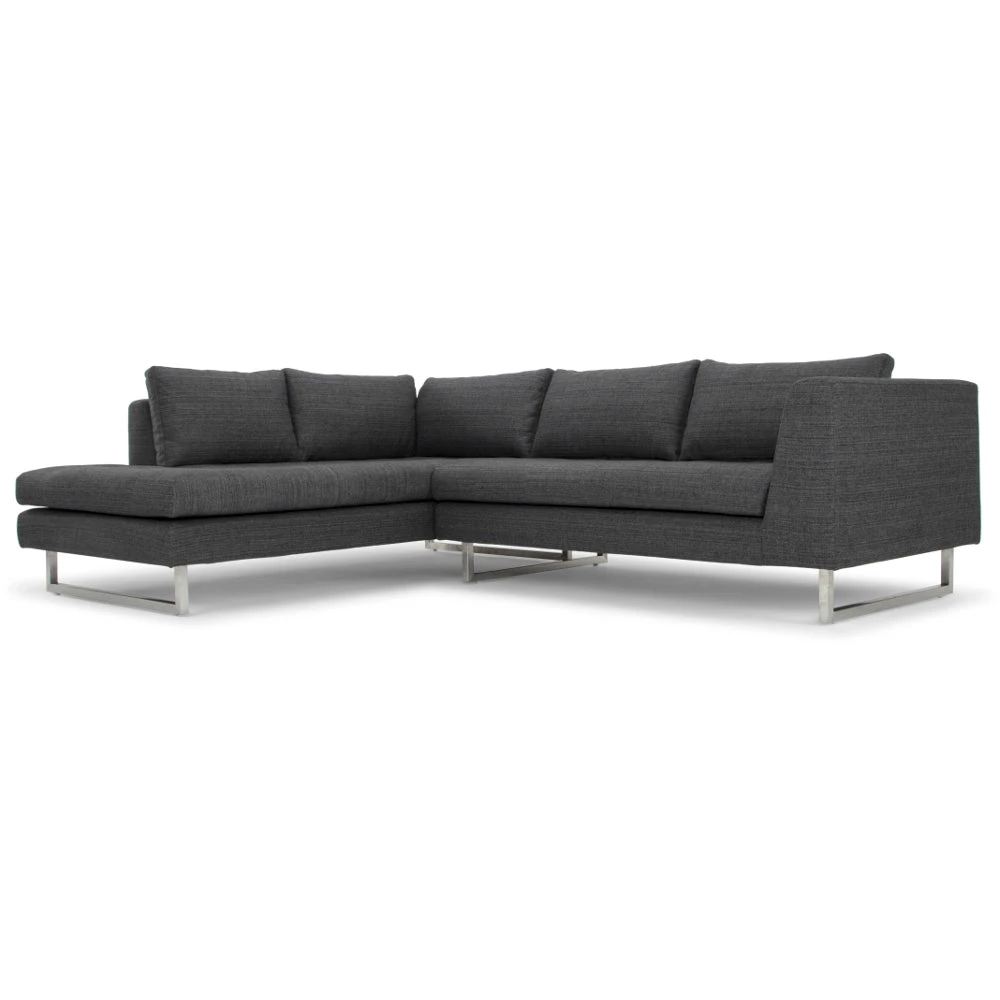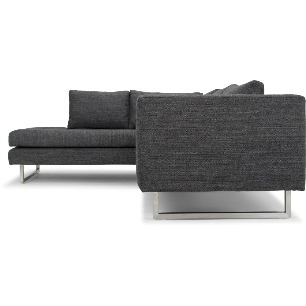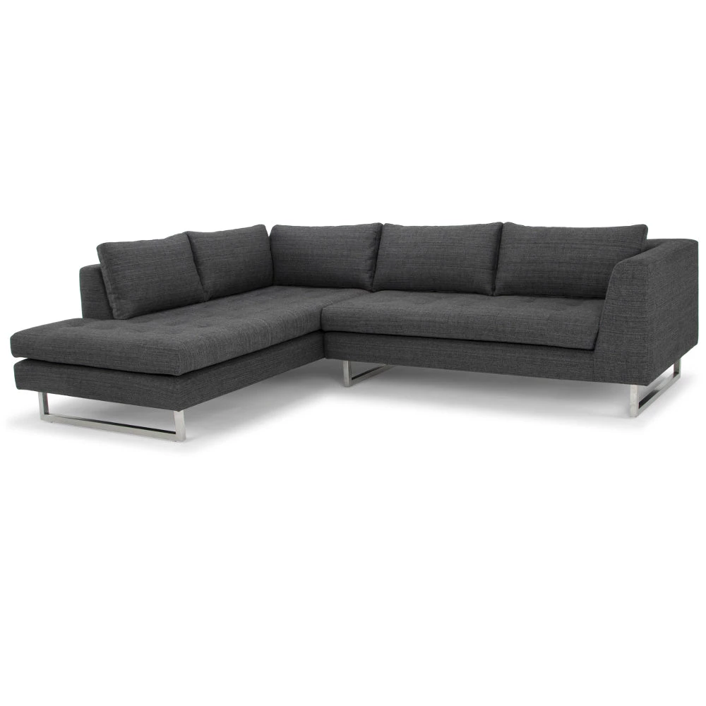 The Janis Sectional is a step above the rest upholstered in a durable dark gray tweed, button tufting and modern stainless steel legs. THe Janis is constructed from New Zealand pine joined by block and screw connections and a European strapping system to provide a right support system for comfort and longevity. The cushions are medium density and dacron wrapped and bagged perfect for taking an afternoon nap. The Janis sectional sofa divides and defines areas of a large living room or place in corner for those tight spaces. Brushed-stainless legs support broad plush tufted seating for up to seven adults. Available in left- and right-hand-facing configurations.