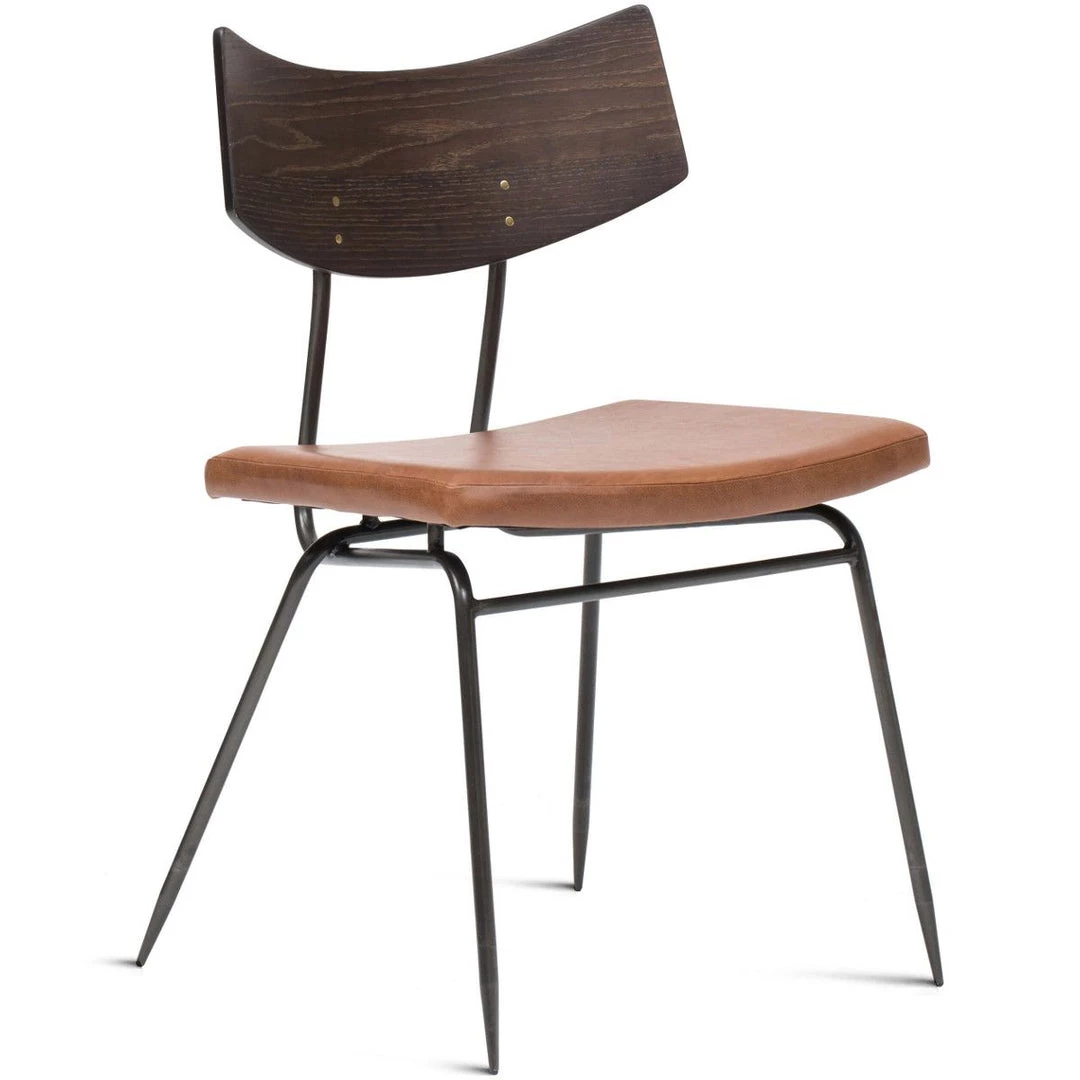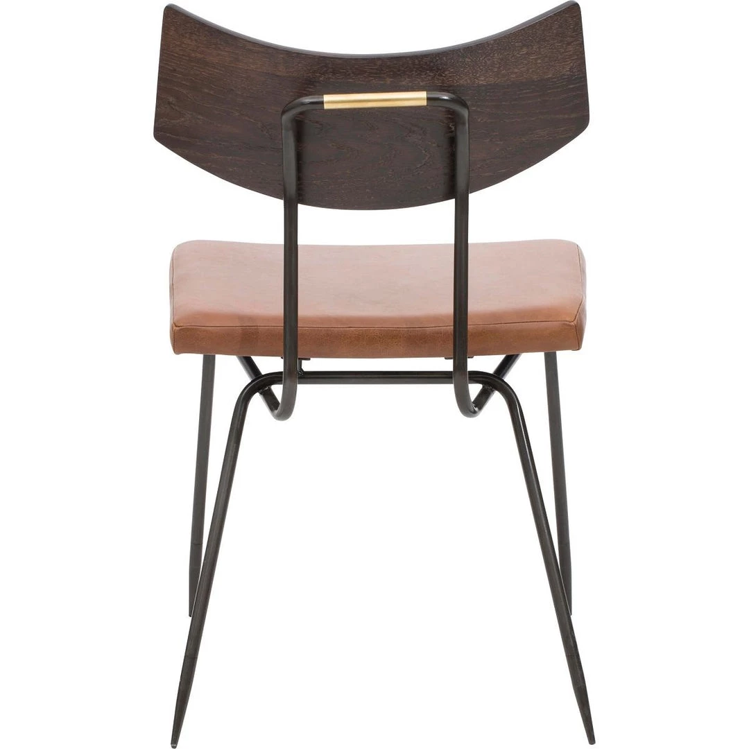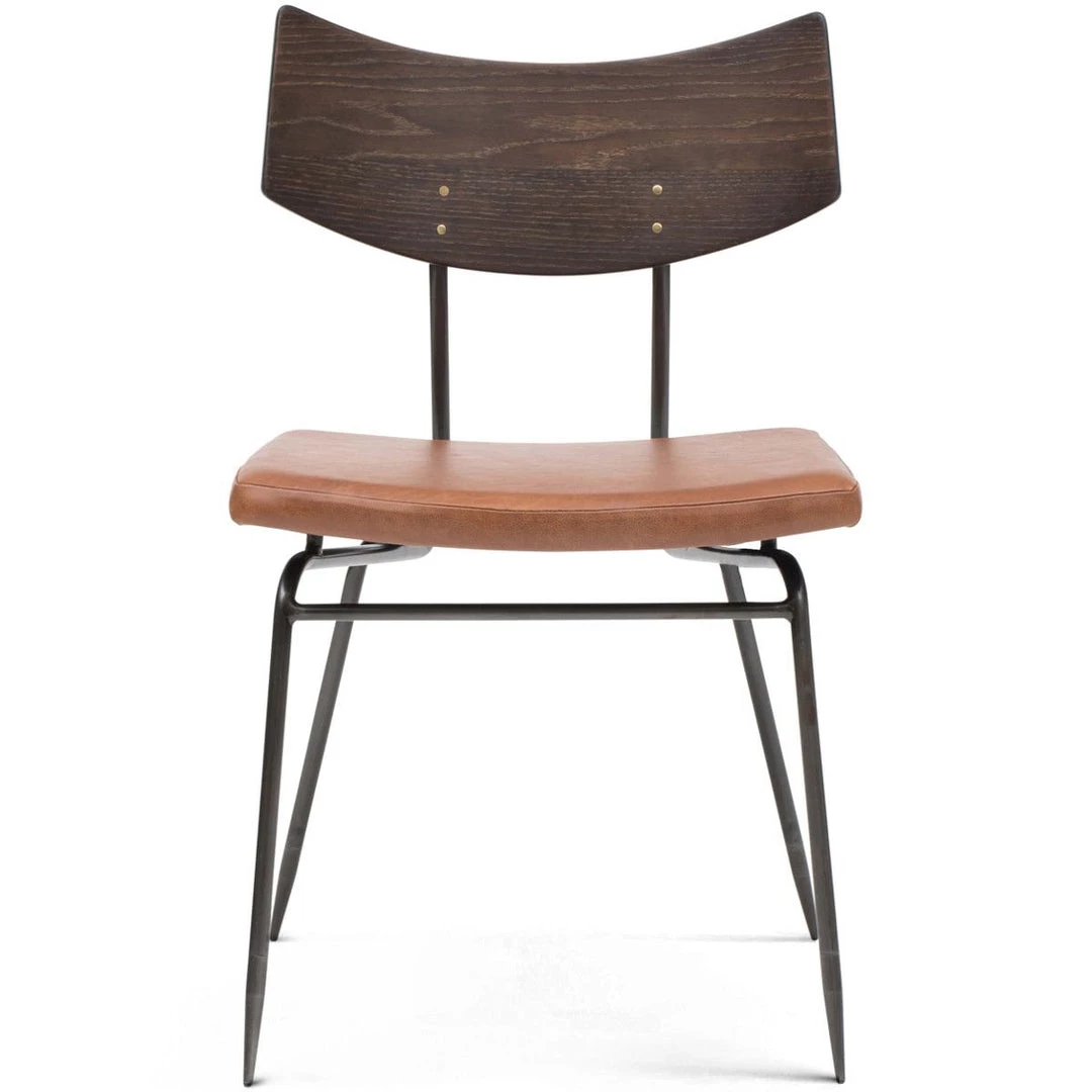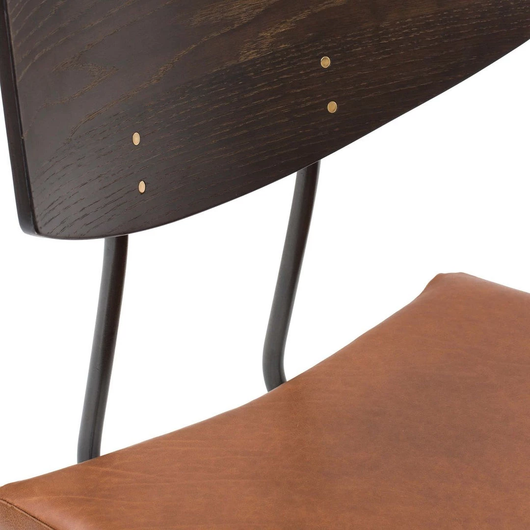 The Soli Dining Chair is the definition of modern industrial style with a tapered black steel frame, curved oak wood backrest, and finished with a genuine leather seat.