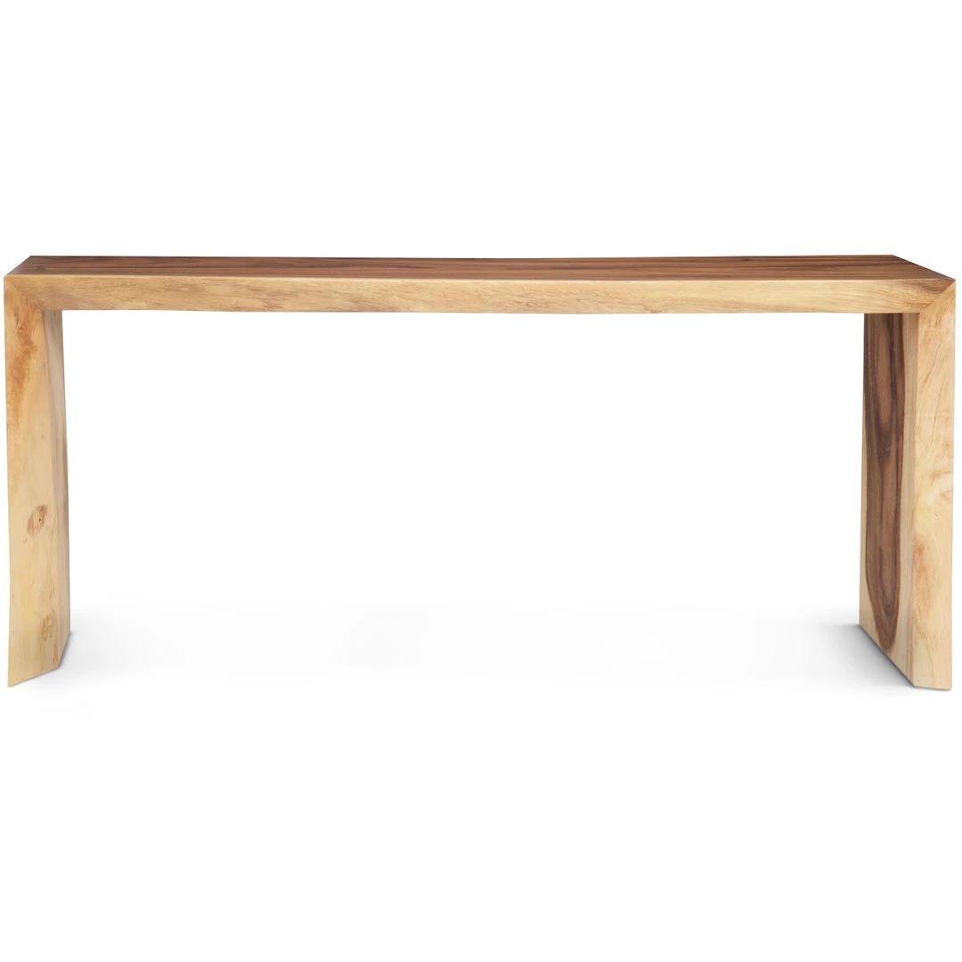 Each Waterfall Console Table by Phillips Collection is made from one slab of wood. This artisan technique takes the mitered edge where the cuts occur and folds them at a ninety-degree angle so the grain continues along the sides.