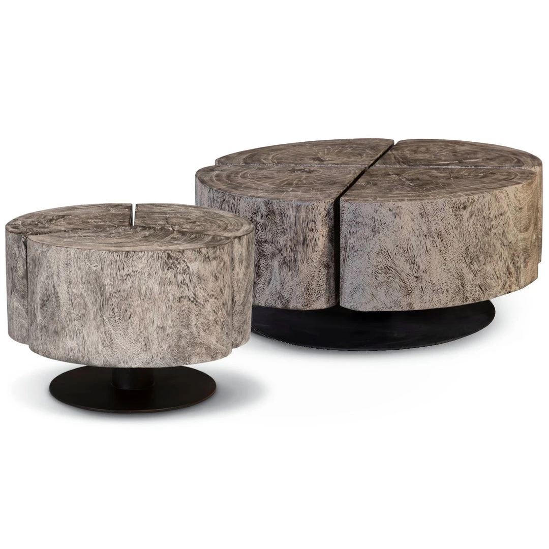 You won’t need any other lucky charm when you place the Clover Grey Stone Coffee Table in a room. Carved from blocks of chamcha wood, the curved sections that make up the top are affixed to a black metal base. What makes this wood coffee table extra special are the swirls of graduated hues that darken as they flow toward the middle, the whorls representing the rings of the tree as it grew. This is only possible because we have reclaimed a portion of a massive felled specimen that would have been abandoned to decompose on the forest floor and made a piece worthy of its beauty.