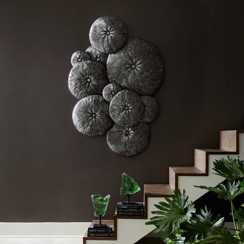 Illustrating the talent of our finish artisans, the Fungia Cluster Wall Art is made of composite with a hand-applied silver leaf finish over which antiquing is rubbed into the crevices. This dual finish treatment brings the circlets in varying sizes a powerful punch of texture in a space. For those who love the idea of gallery-wall installations but who don’t want to take the time to arrange decorative sculptures on the wall, we’ve done the heavy lifting for you. This piece of circular wall art reflects the ethos that Phillips Collection personifies: modern organic.