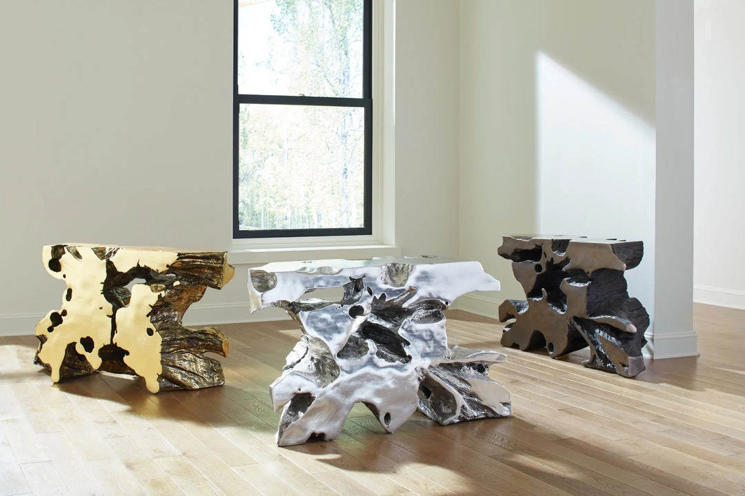 Organic form and luxe finishing come together to make this tree trunk slice free form console a true statement piece. Cast from resin with a handsome bronze finish.