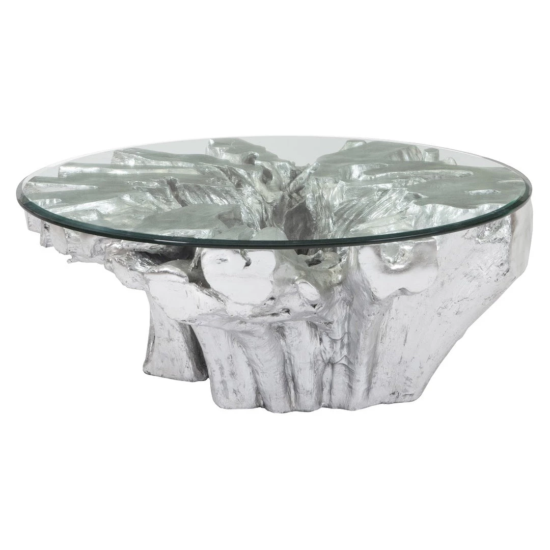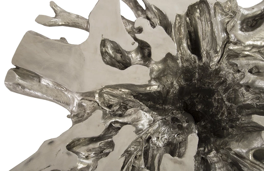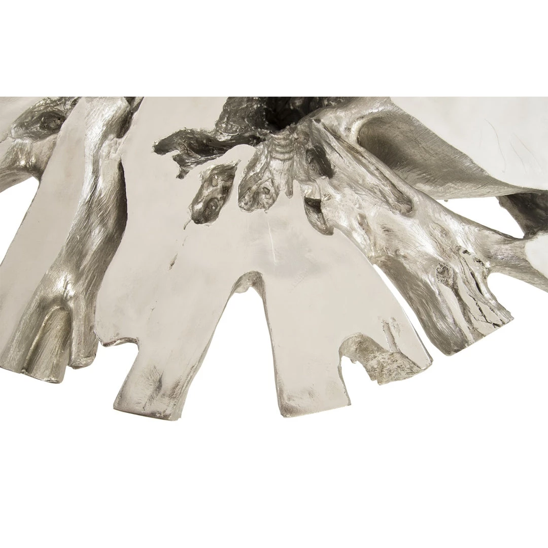 This freeform table is cast from a real piece of solid wood. We carefully preserve all the natural details of the original so that this silver leaf version has the same lines and indentations still intact. We lovingly source our wood and find pieces we believe will be both functional and beautiful.
