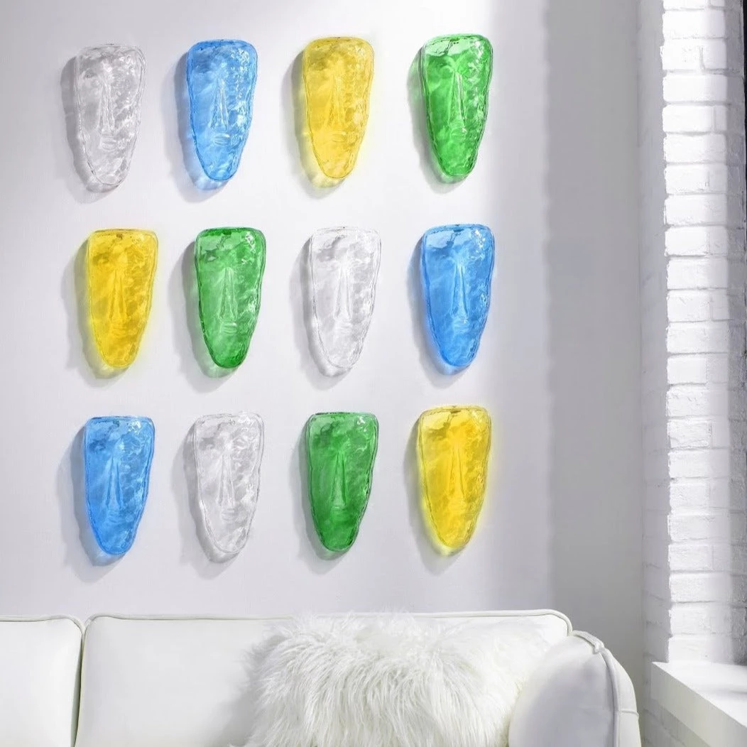 Cast glass takes an altogether contemporary and color appearance in these Glass Faces. Available in a rainbow of colors and easy to mount, they are sure to become the jewelry of the room.