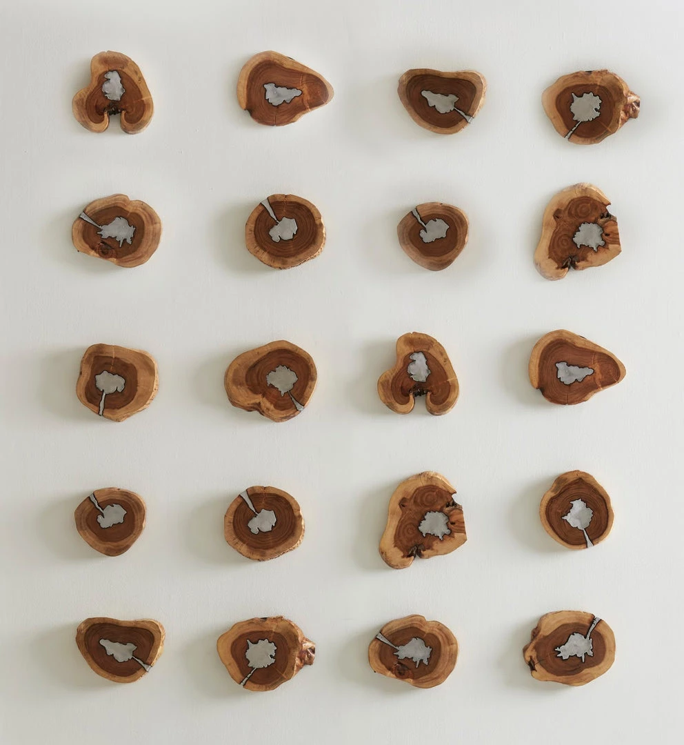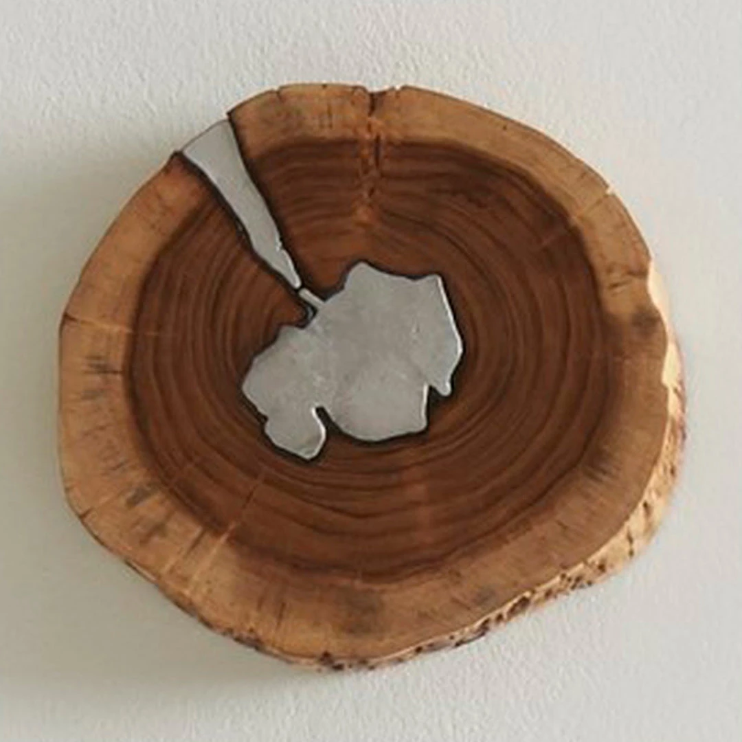 Molten Wall Discs made from combining molten brass with reclaimed Sheesham wood. The process of achieving this perfect marriage requires just the right temperature of the liquid metal. The charred edge where the metal meets the wood gives it a rich character. Each piece will vary ever so slightly. Simple to mount with a single screw in a keyhole for flush application to the wall. Diameter 11”.