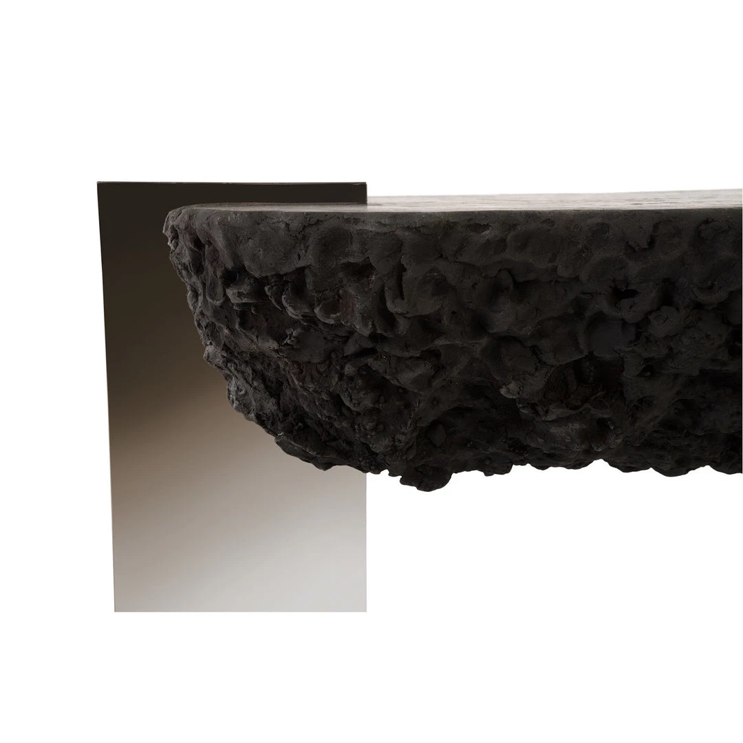 Cast in resin to look like a rough stone and completed with stainless steel accents, these rough and rugged tables have a glamorous look with the shine of polished stainless steel.