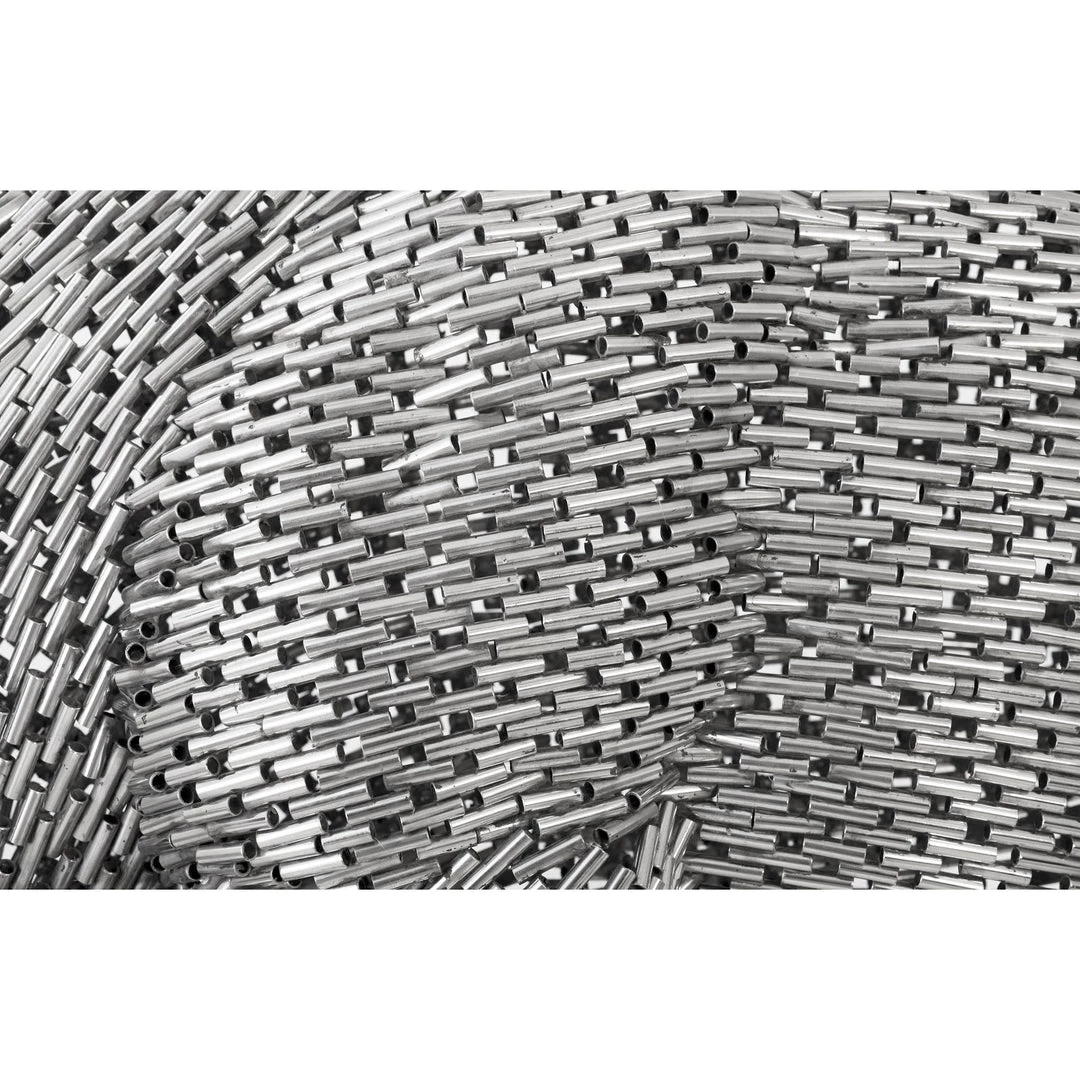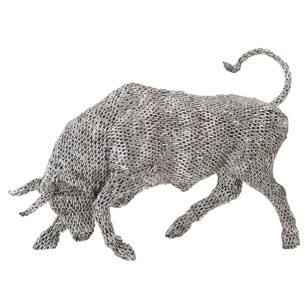 A true testament to artistry, the Bull Pipe Sculpture illustrates how a talented artisan can take a brute material and bring it a sense of movement. With muscles rippling and tail flashing, the silver sculpture, which is made of stainless steel, achieves the sense of motion that convinces the senses that its nostrils are flaring. The mesh material that flows along the surface of this decorative accessory is textural in nature, which makes this metal sculpture perfect for a room that can benefit from a bit of an edge.