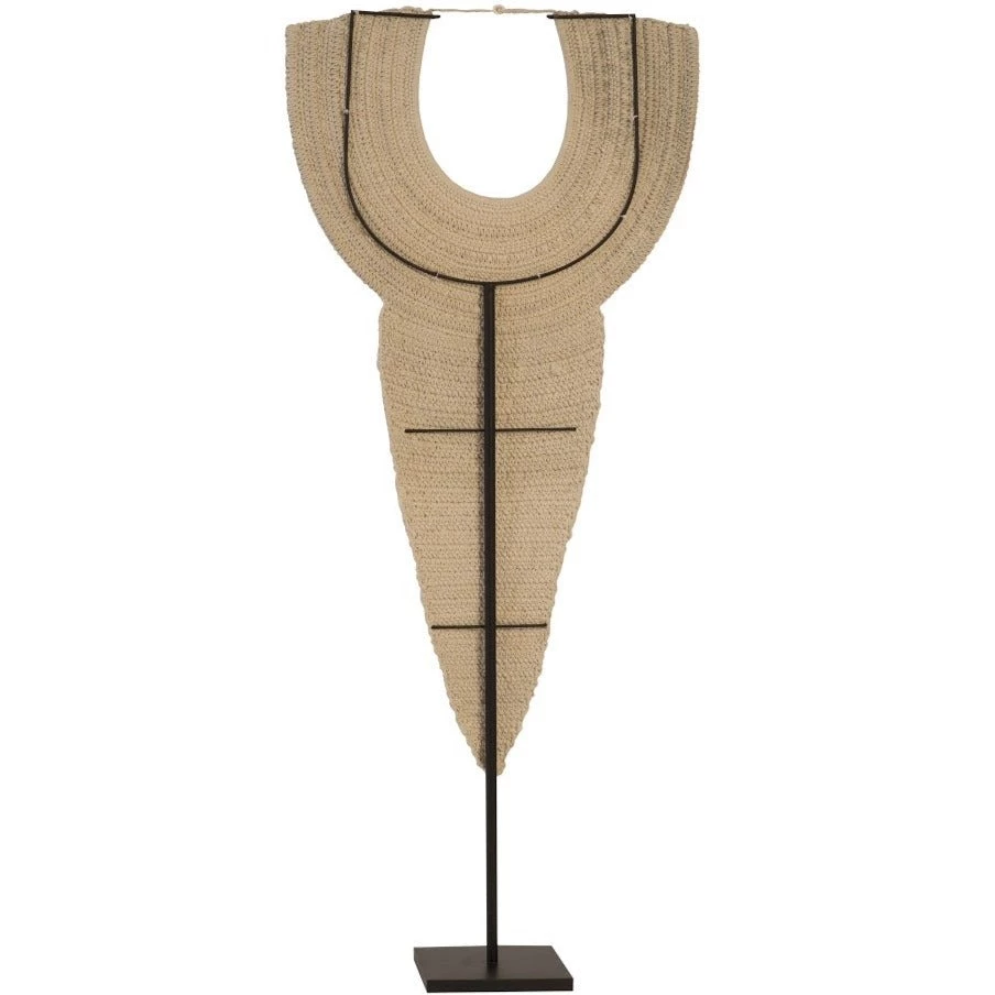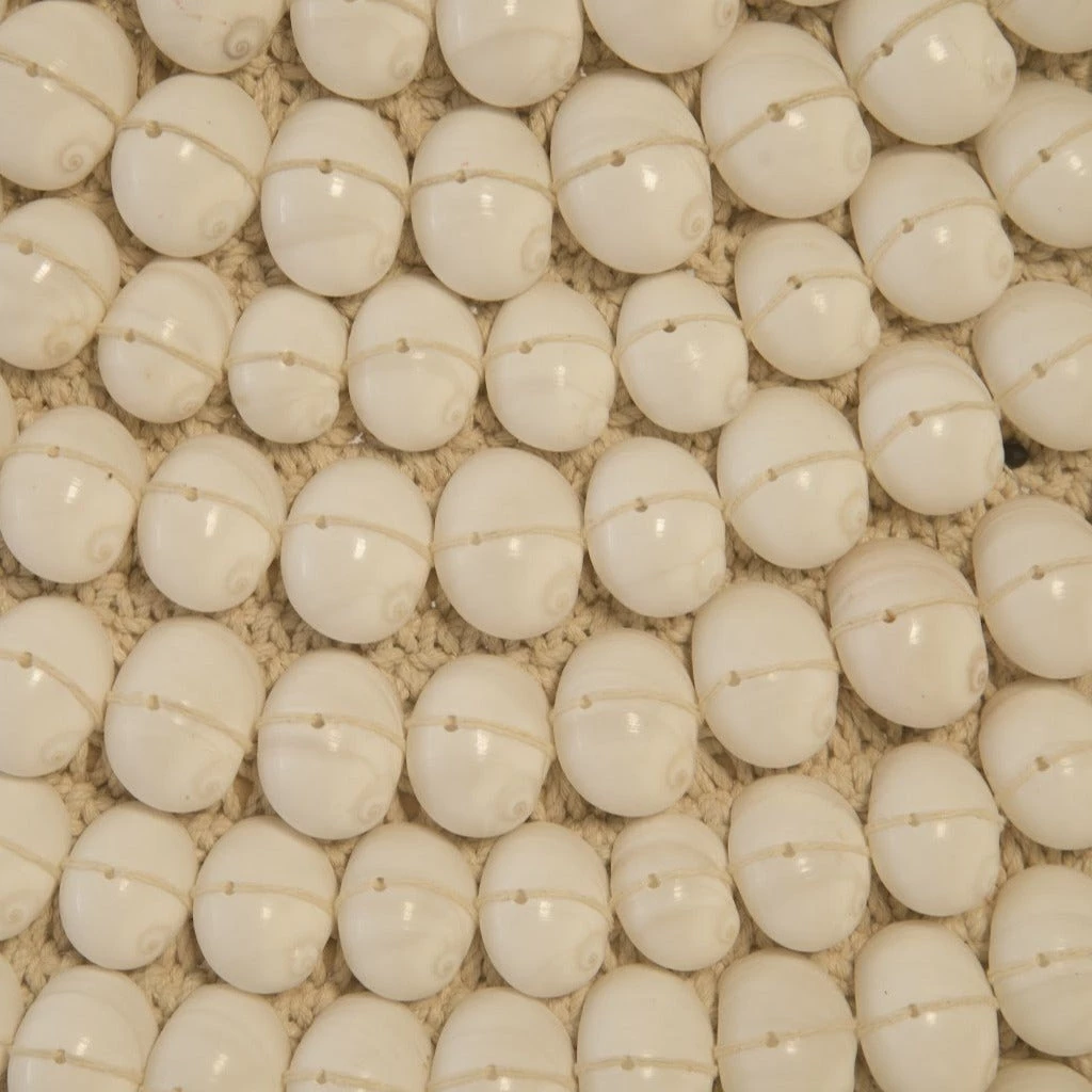 The Giant Shell Necklace Sculpture from Phillips Collection is handmade with natural shells threaded through a neutral fabric. Displayed on a metal stand, this colossal necklace can stand alone as a floor sculpture, or be place on a table as an oversized accent piece.