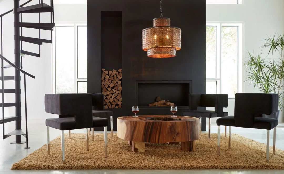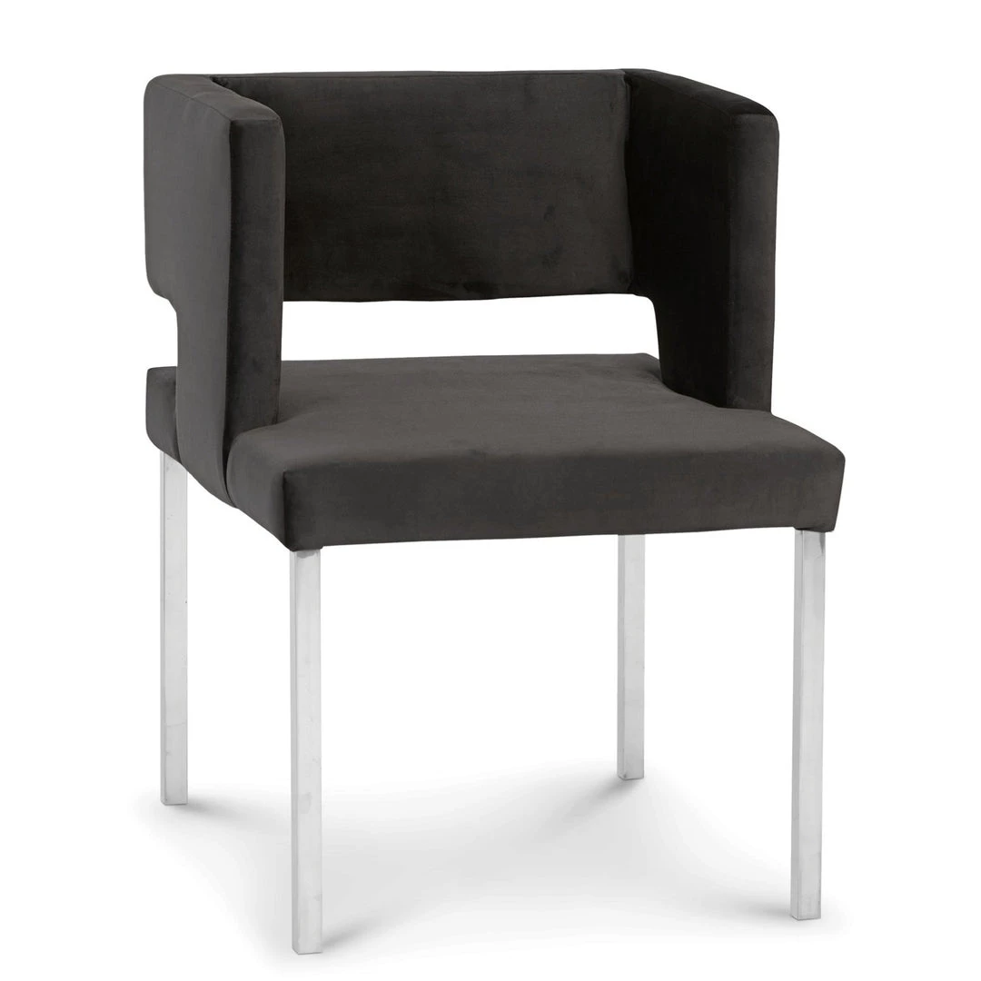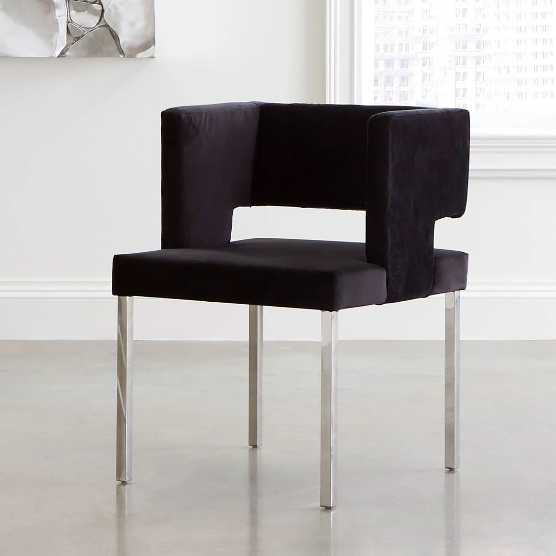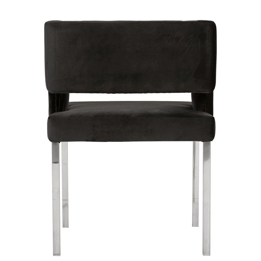 Armed dining chair with a comfortably cushioned seat and back. Velvet-like black fabric on a frame with clean lines. Sits on four polished stainless steel straight legs. Simple and glamorous all at the same time.