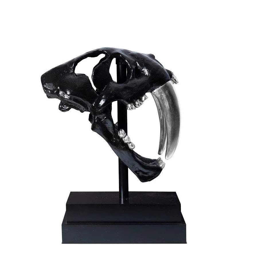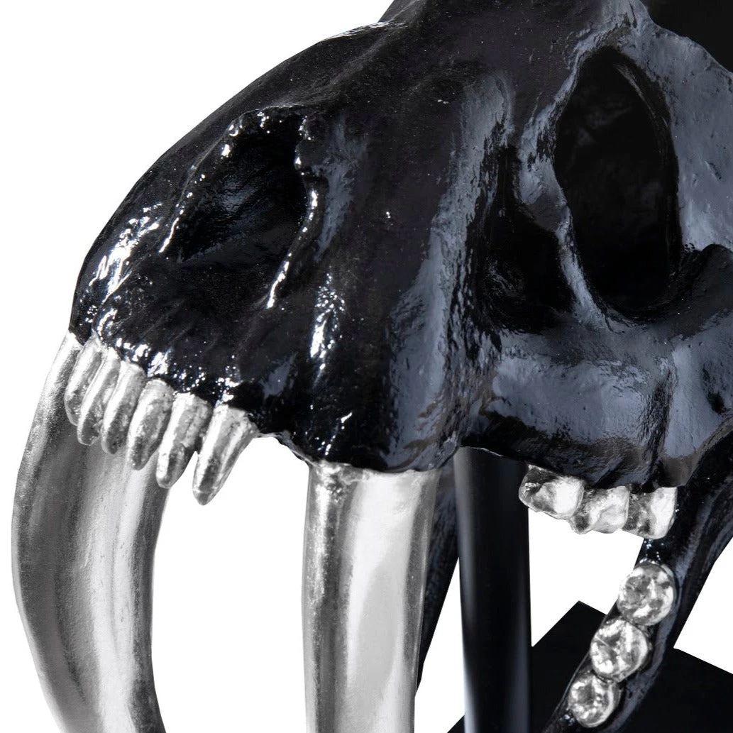The Black Saber Tooth Tiger Skull brings a room all of the exoticism the big game hunter has been afforded throughout history without having to spend time schlepping through jungles! Plus, there’s no guilt for the non-hunter with our toothy black sculpture, as it is made of metal in a black finish. We’ve added a hint of glint to this jaw-dropping decorative accent by covering the tiger’s teeth in silver leaf.