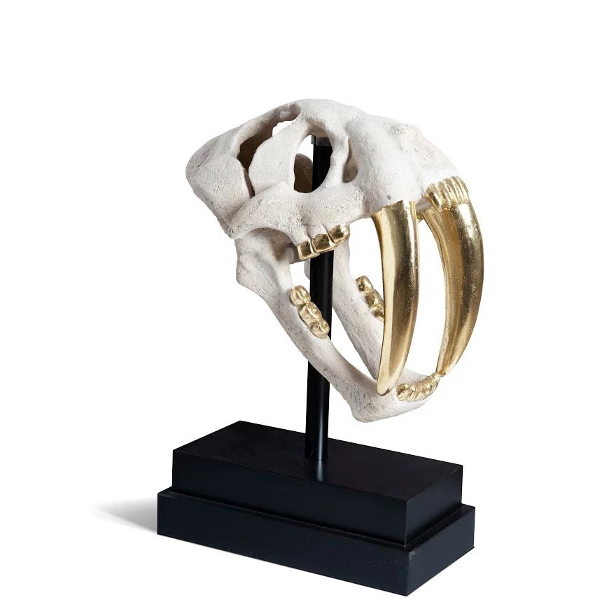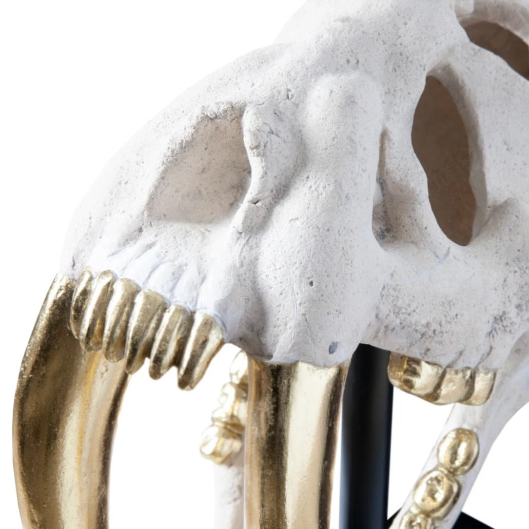The White Saber Tooth Tiger Skull brings a room all of the exoticism the big game hunter has been afforded throughout history without having to spend time schlepping through jungles! Plus, there’s no guilt for the non-hunter with our toothy white sculpture, as it is made of metal in a Roman stone finish. We’ve added a hint of glint to this jaw-dropping decorative accent by covering the tiger’s teeth in gold leaf.