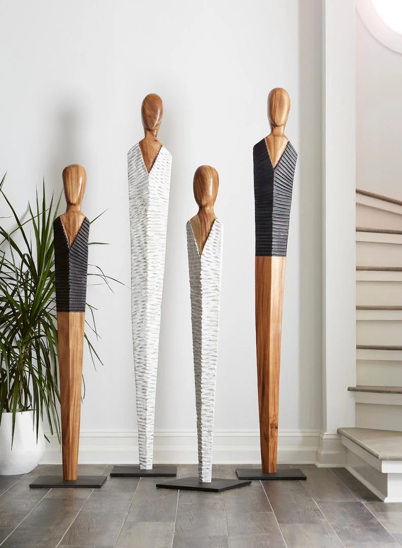 Slender human figures sit on metal bases. Carved from solid wood with textured etching and painted to complete a robed appearance. Serene and charming sculptural accents for any space.