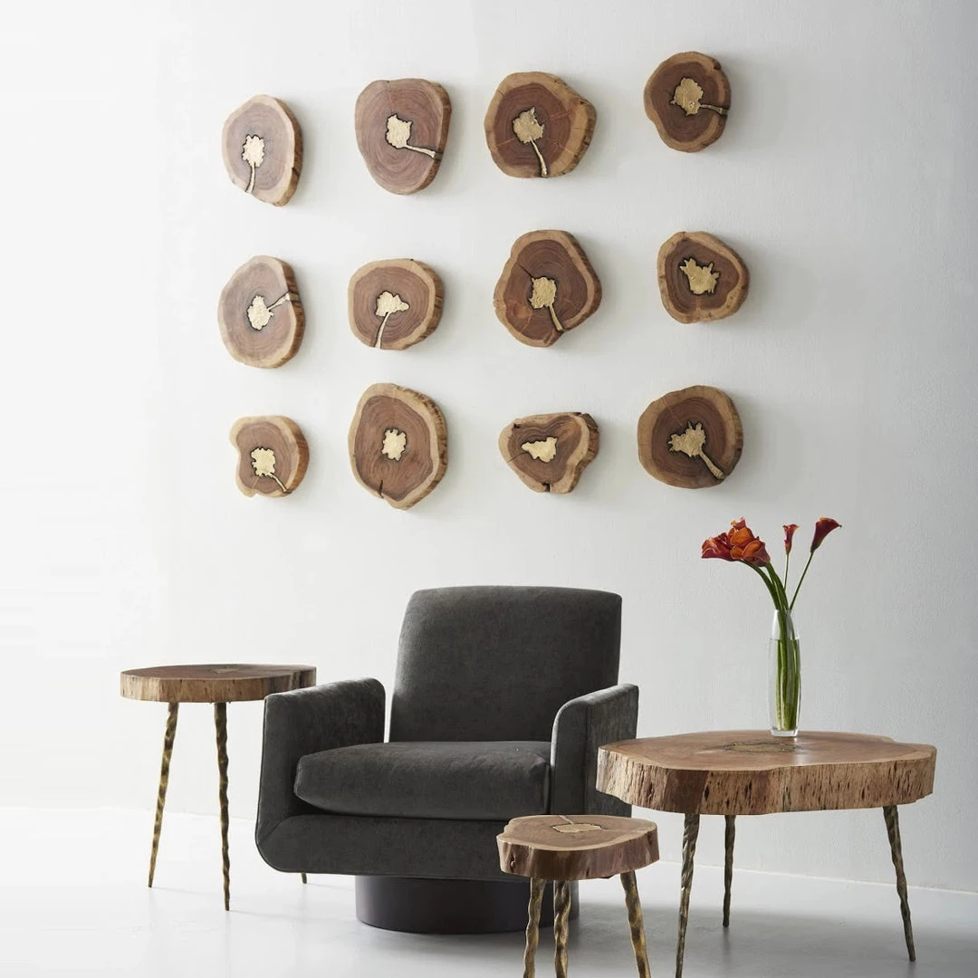 Molten Wall Discs made from combining molten brass with reclaimed Sheesham wood. The process of achieving this perfect marriage requires just the right temperature of the liquid metal. The charred edge where the metal meets the wood gives it a rich character. Each piece will vary ever so slightly. Simple to mount with a single screw in a keyhole for flush application to the wall. Diameter 11”.