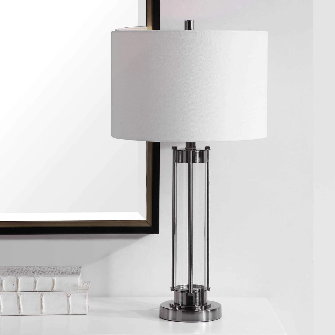 This simple, clean design is enhanced with a light black nickel finish on the details and stacked base. The round hardback shade is a white linen with natural slubbing.