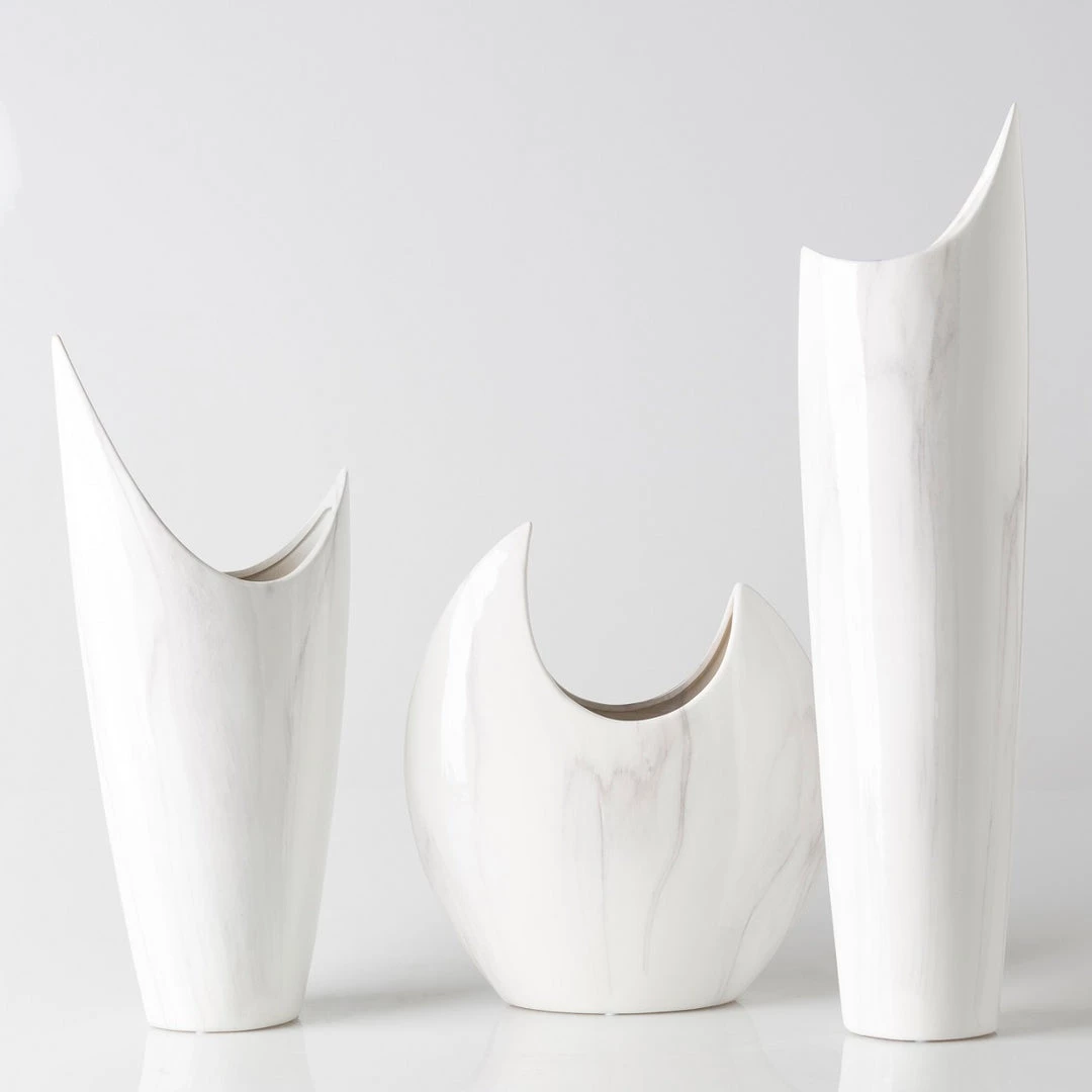 Set of three white crescent vases. Finish has subtle marbling that is unique to each piece.
