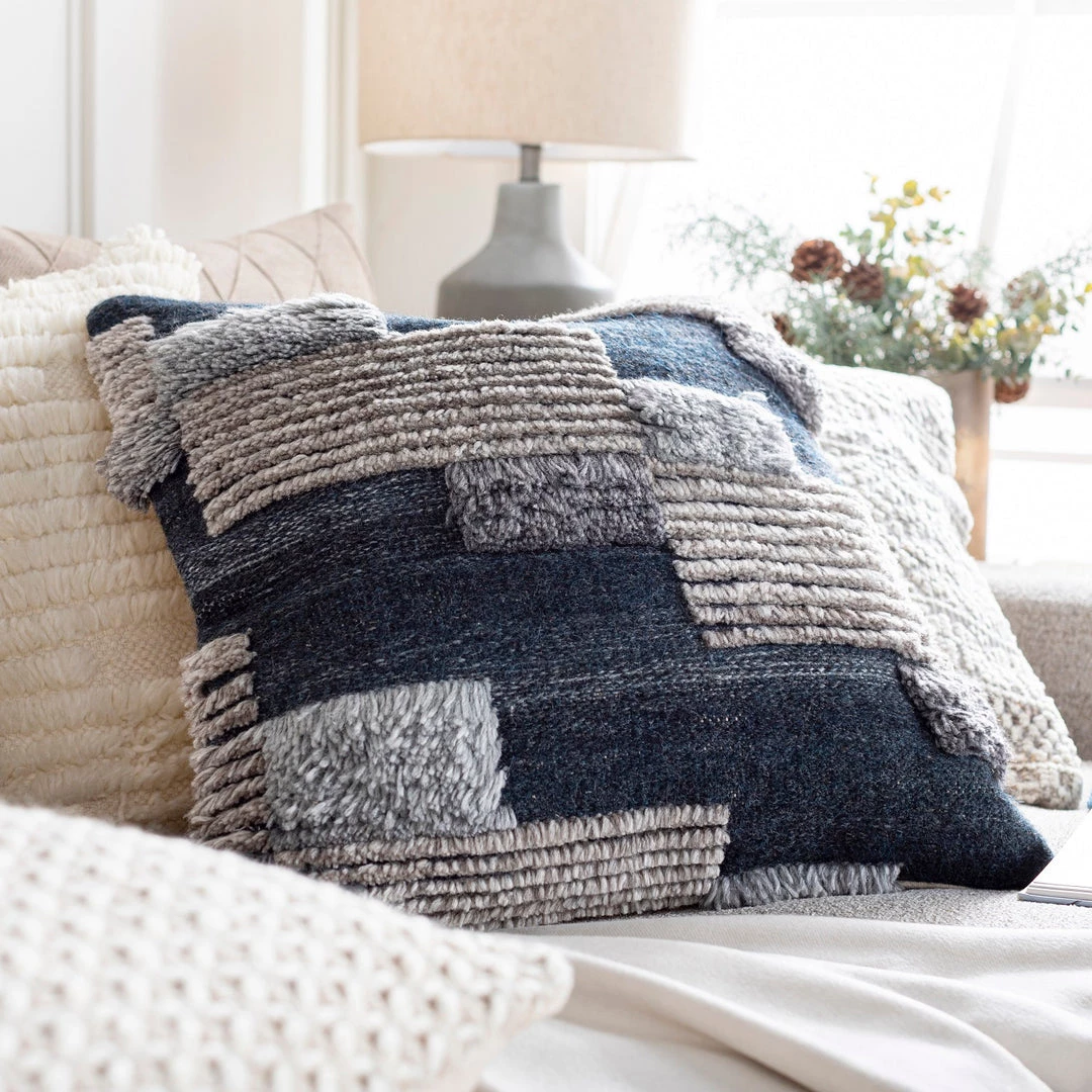 The Belu pillow collection is all about cozy texture with global inspired fringe designs in earthy neutrals and blue hues.