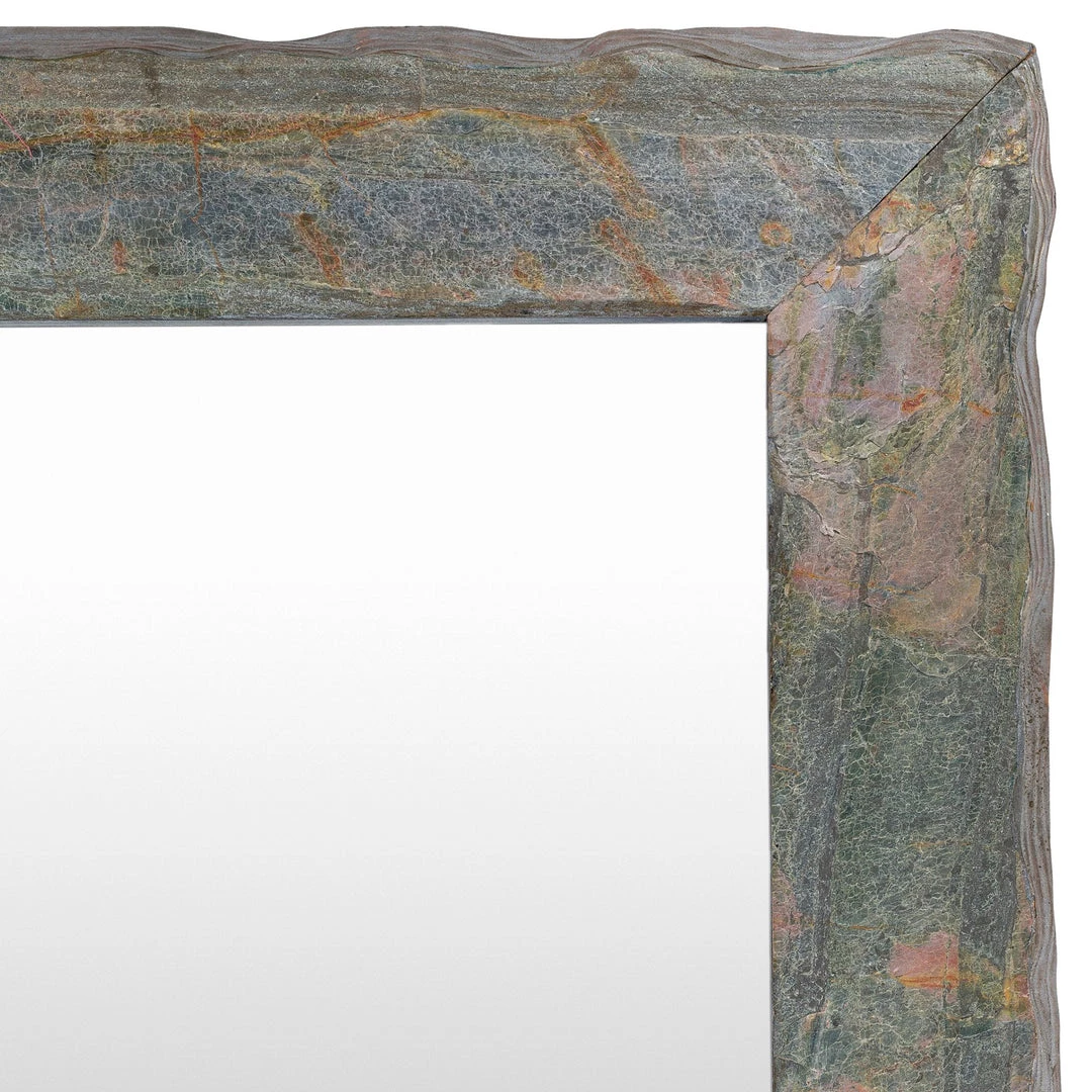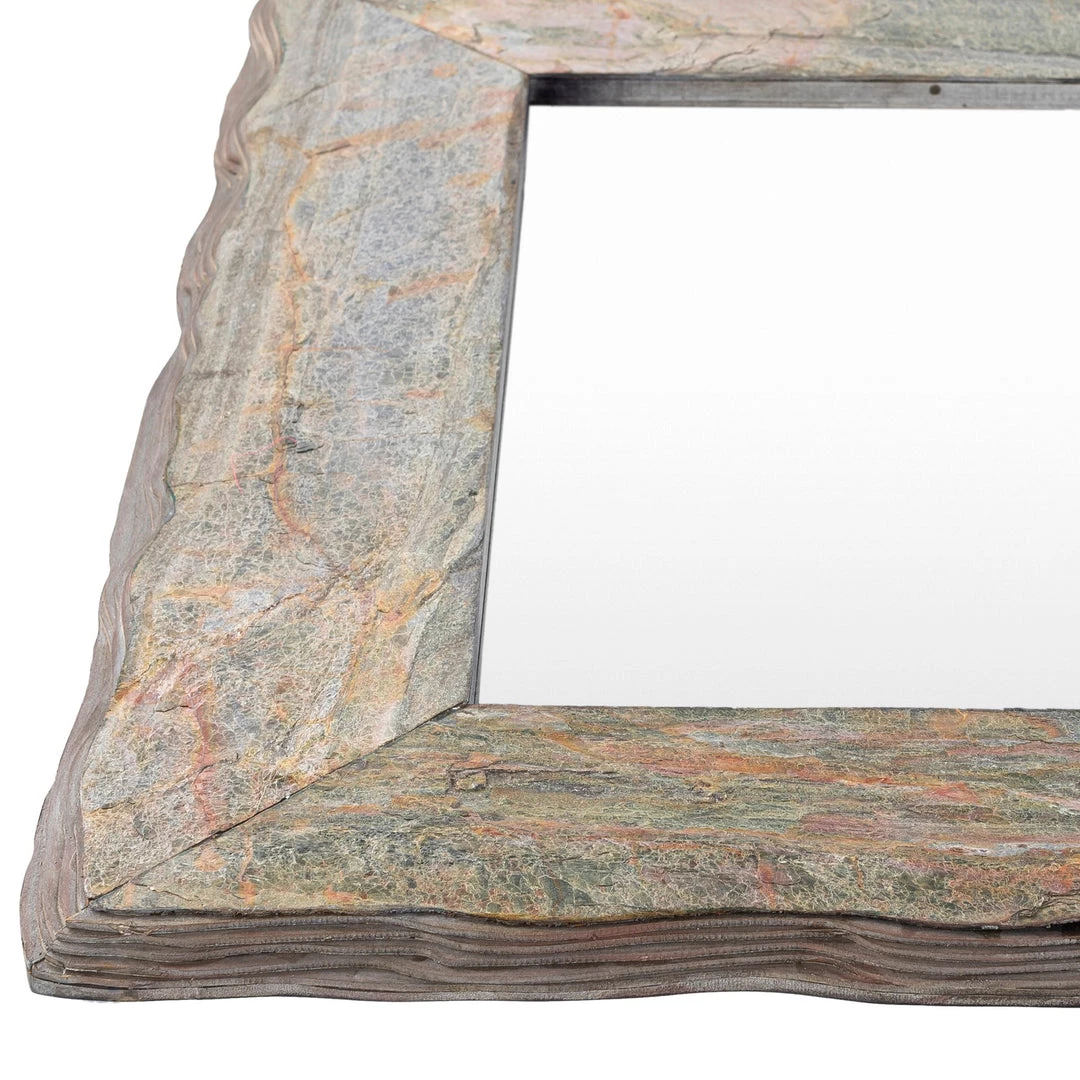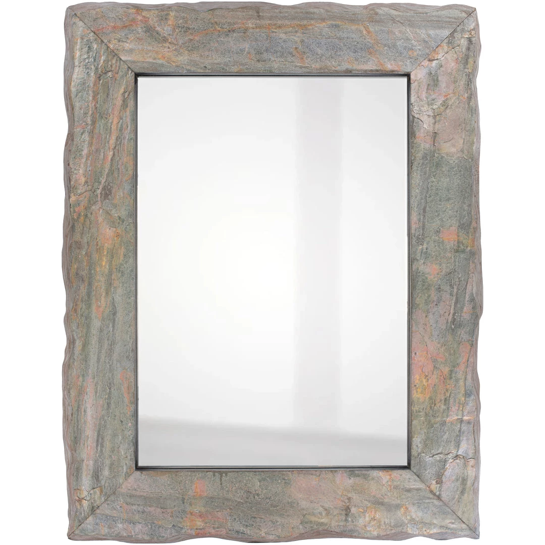 Textured layers of composite stone in natural and desert twilight hues come together to frame this earthy eclectic wall mirror. Color and finish may vary.