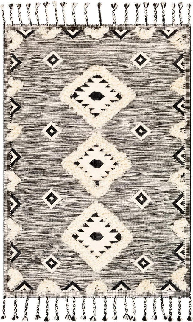 The Ebba Rug features a striking global inspired design with a meticulously woven construction with fringe texture and tassel detail. Made with Wool in India, and has Plush Pile. Spot Clean Only.